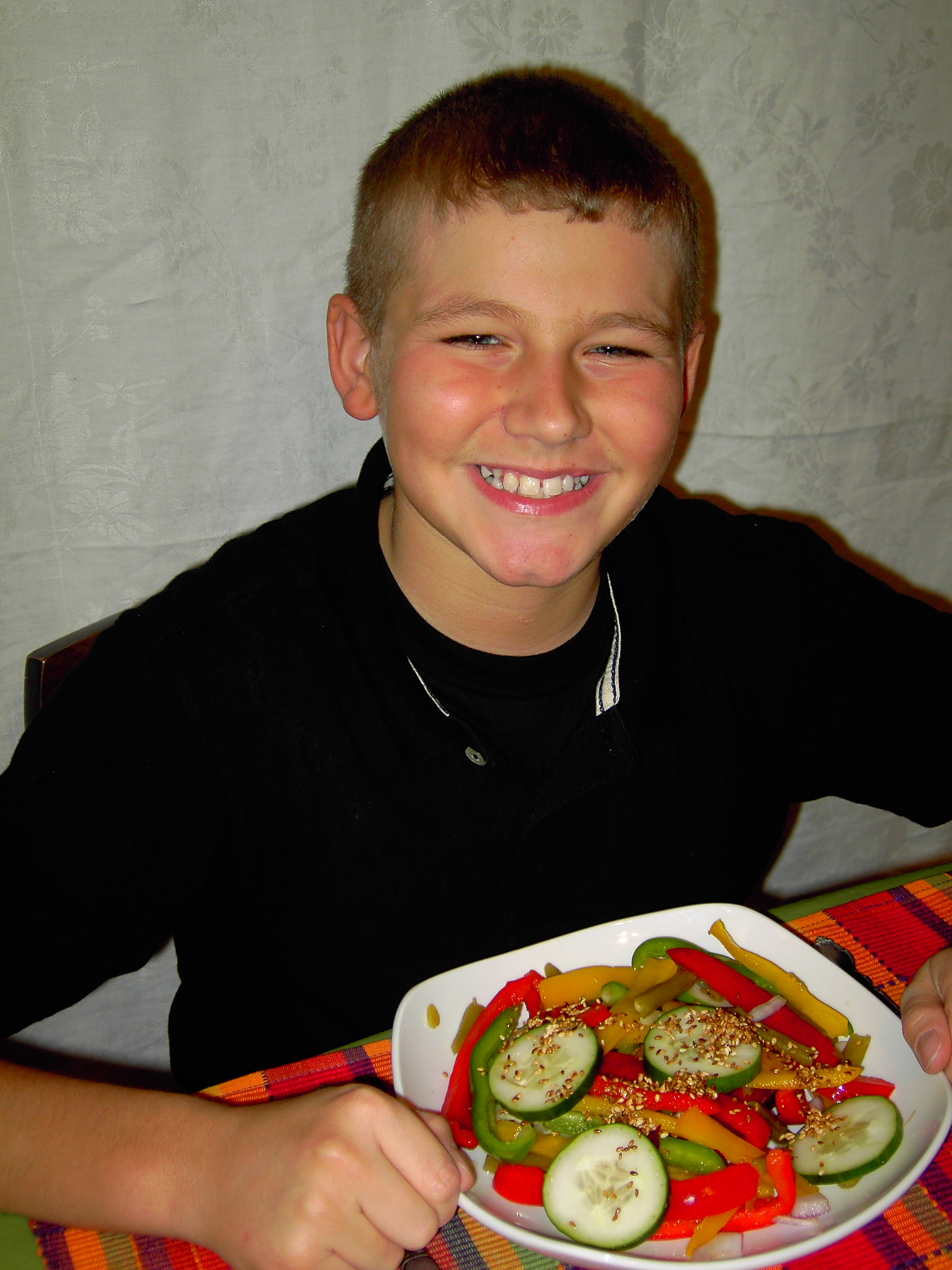 Do you love to crunch your teeth into fresh vegetables like red and yellow peppers and cucumbers? Here is a recipe you’ll want to pull out the cutting board for — Pepper Salad with Sesame Seeds.