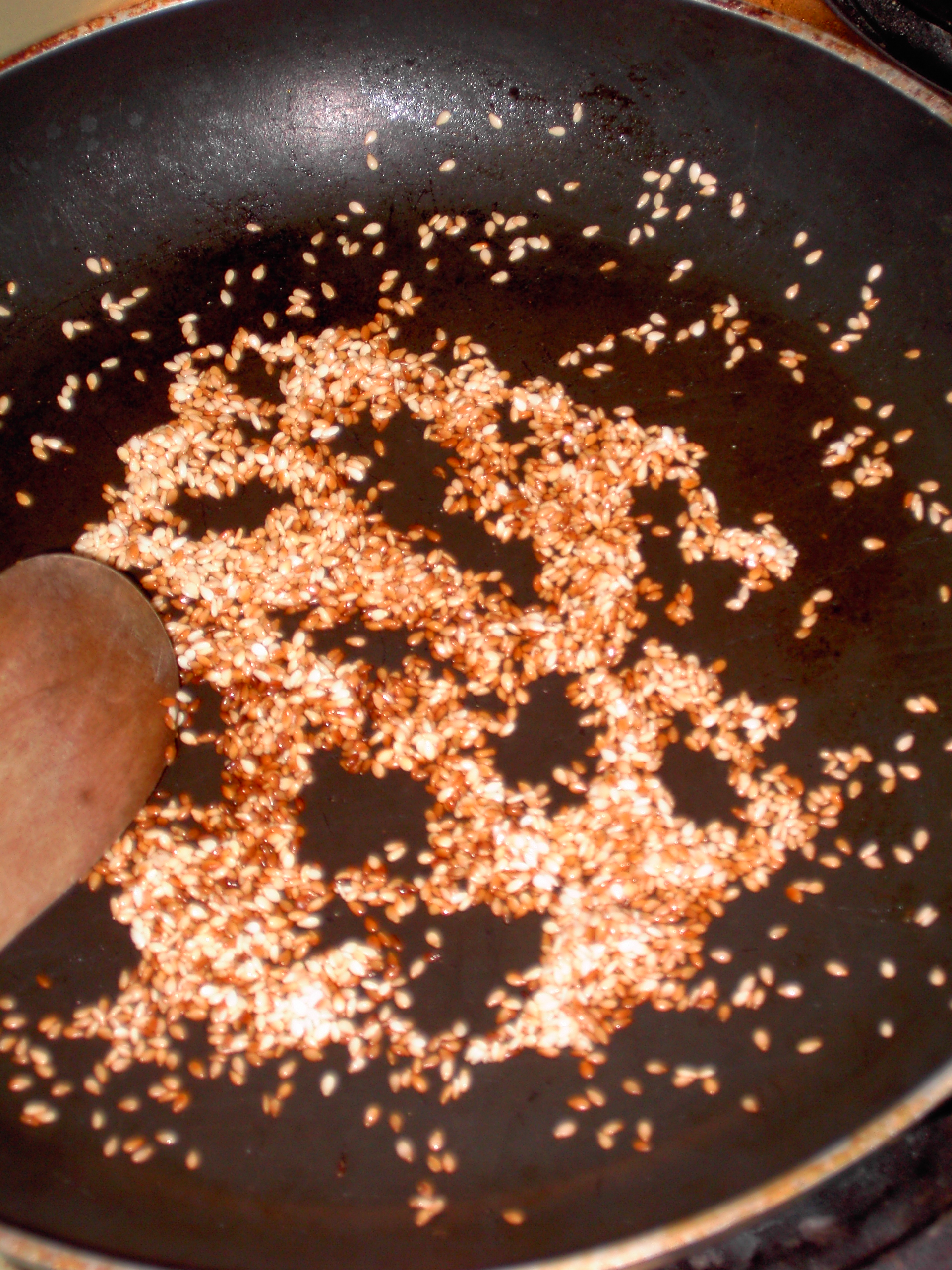 2. Heat sesame seeds in skillet over medium heat, tossing until browned about 3 minutes. Set aside.