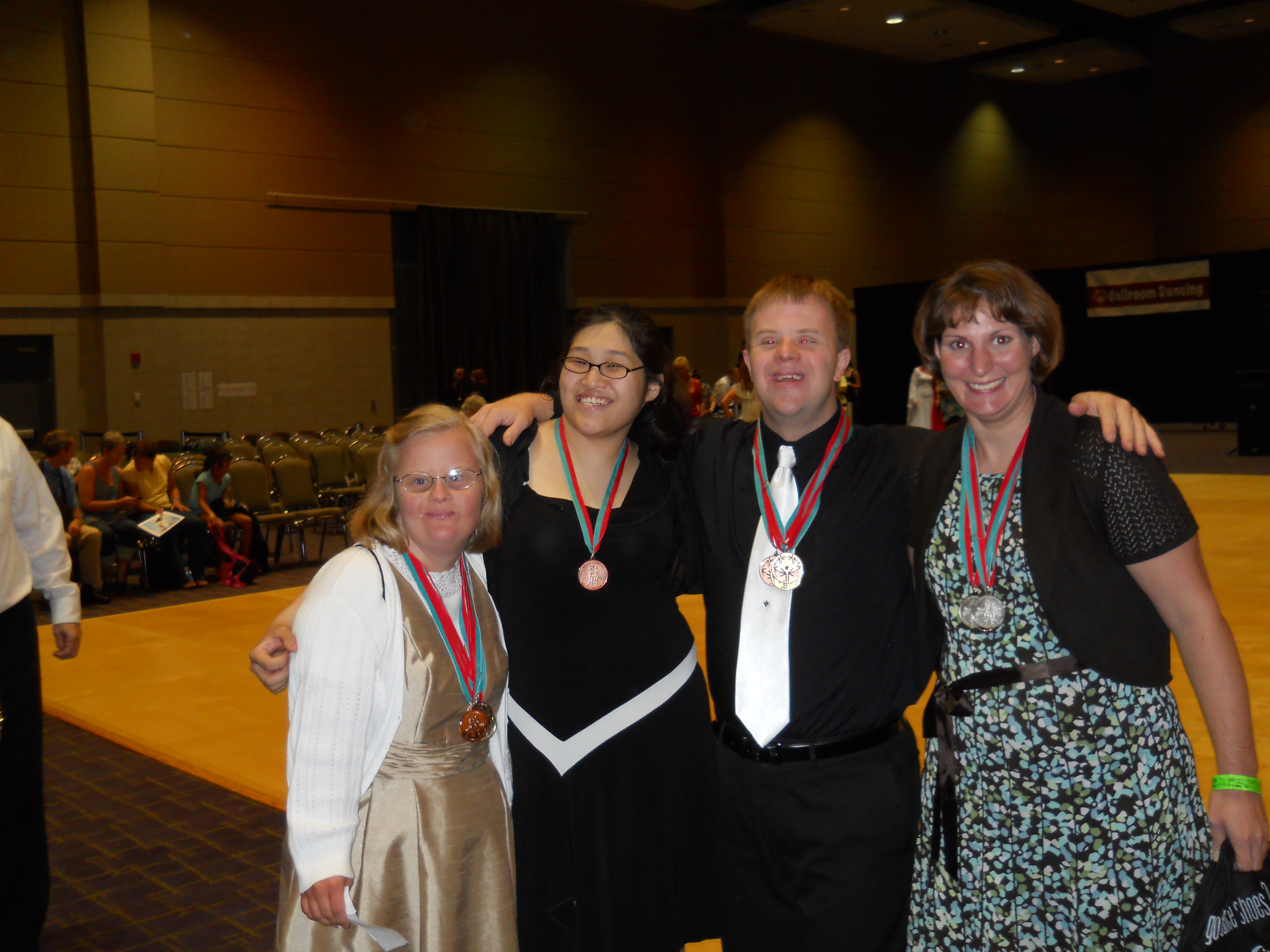 Steffen with (l-r)Amy Isch, Bree Simonovic, and Tifany Jackson during Special Olympics Indiana Ballroom Championships