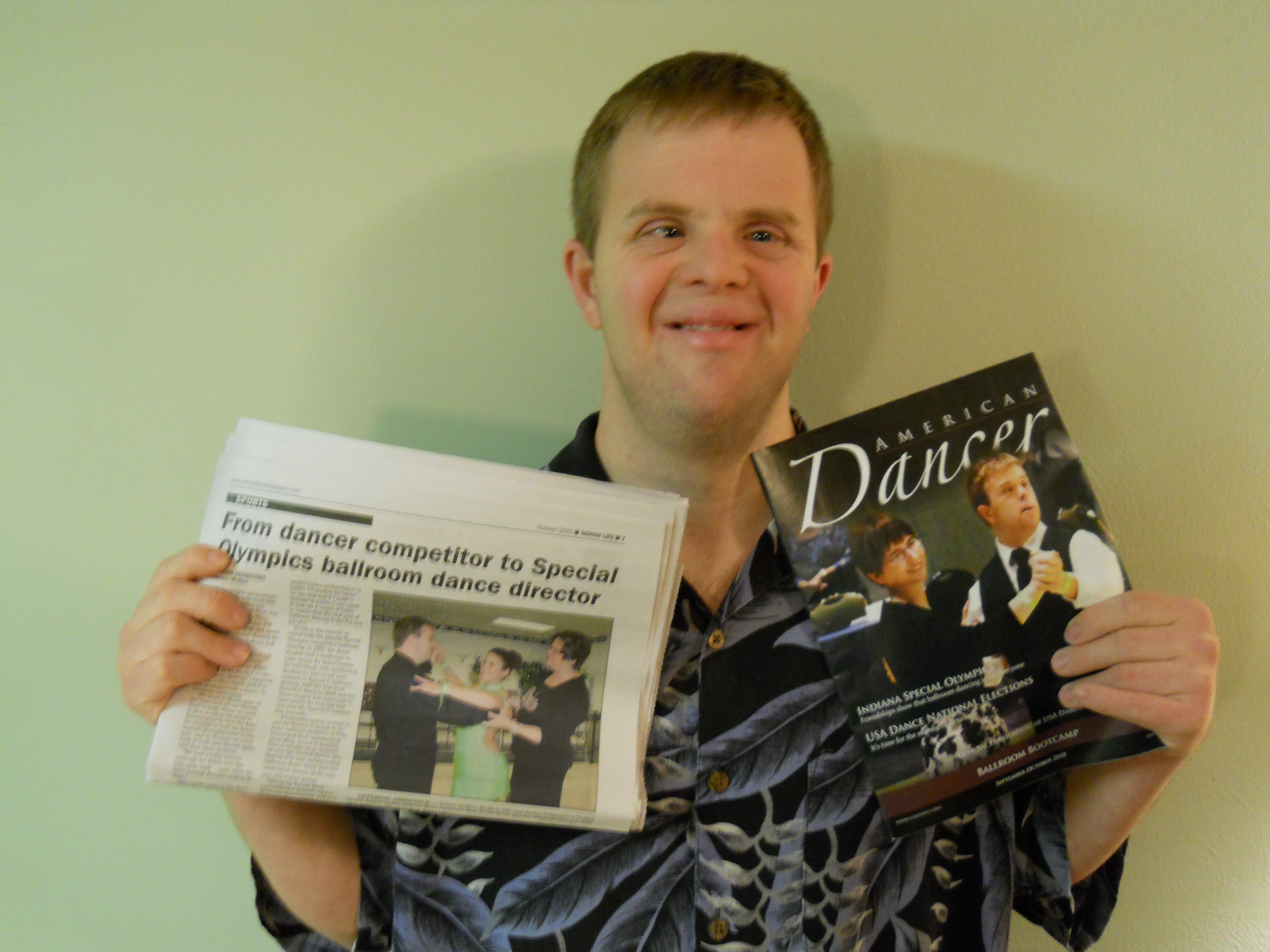 Jordan Steffen displays American Dancer magazine and Senior Life magazine. Both feature photos of him