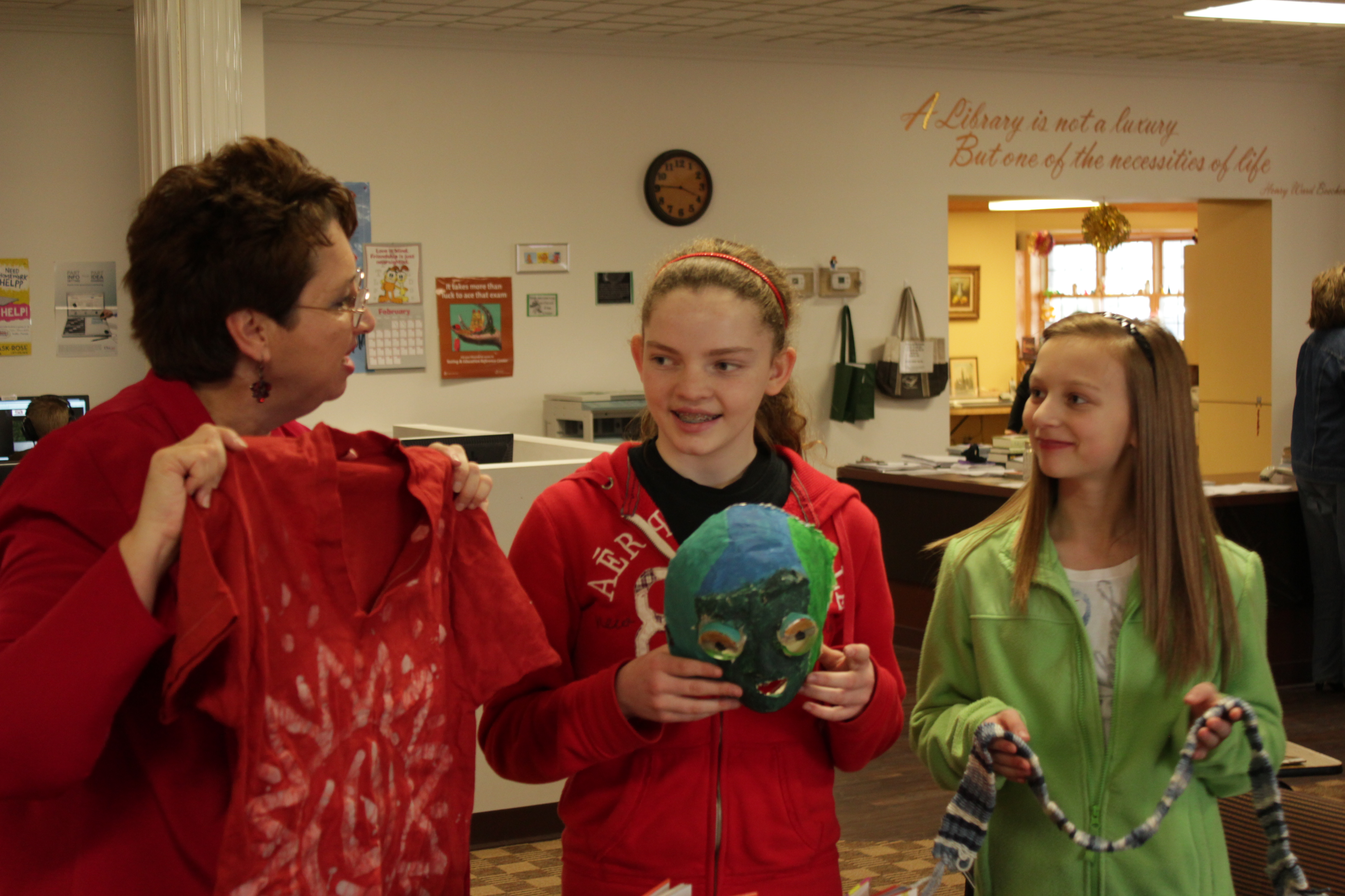 Then I traveled to the Fairmount Public Library where I provided a display of Indonesian arts and crafts – and candy! One lucky teen wanted to try the bag that claimed to be some kind of seaweed candy. When she opened it, it looked as green as what you’d expect! I encouraged her to take the entire bag and she did.