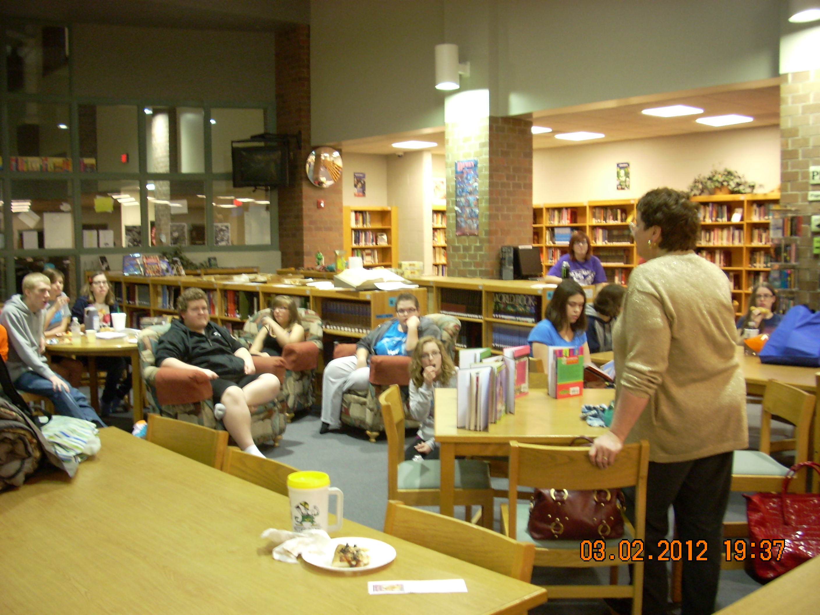 A few days ago I spent a lovely evening with some new friends at Bluffton High School in Bluffton, Indiana. They included me in their “Overnighter” party arranged by the school’s librarian Terry Burns. What a great, fun idea! I wish I could have participated in something like this when I was in high school.