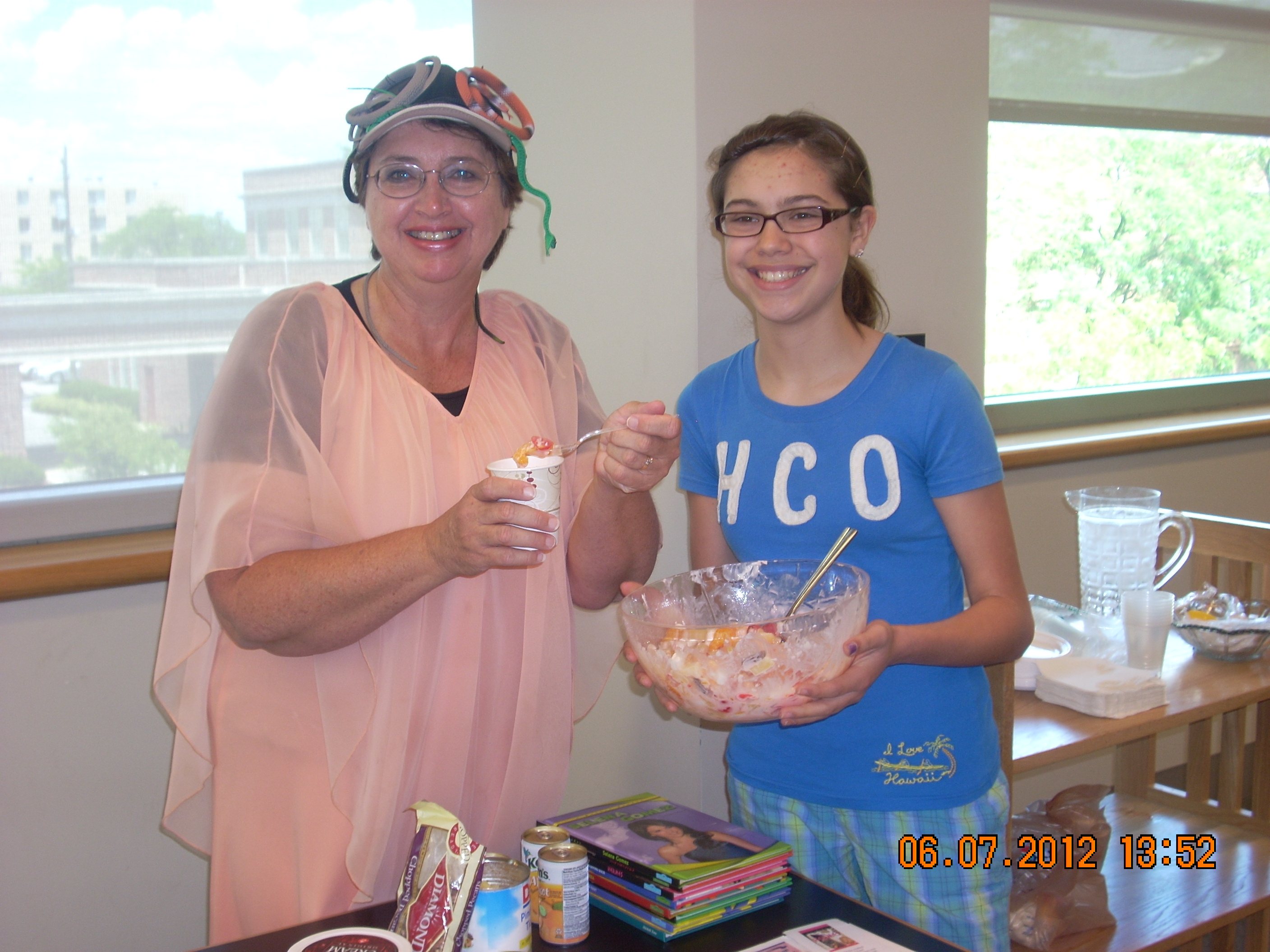 She provided a snack for everyone – the food of the gods: Yummy Ambrosia (coconut, maraschino cherries, sour cream, pecans, Mandarin oranges) and apricot nectar.