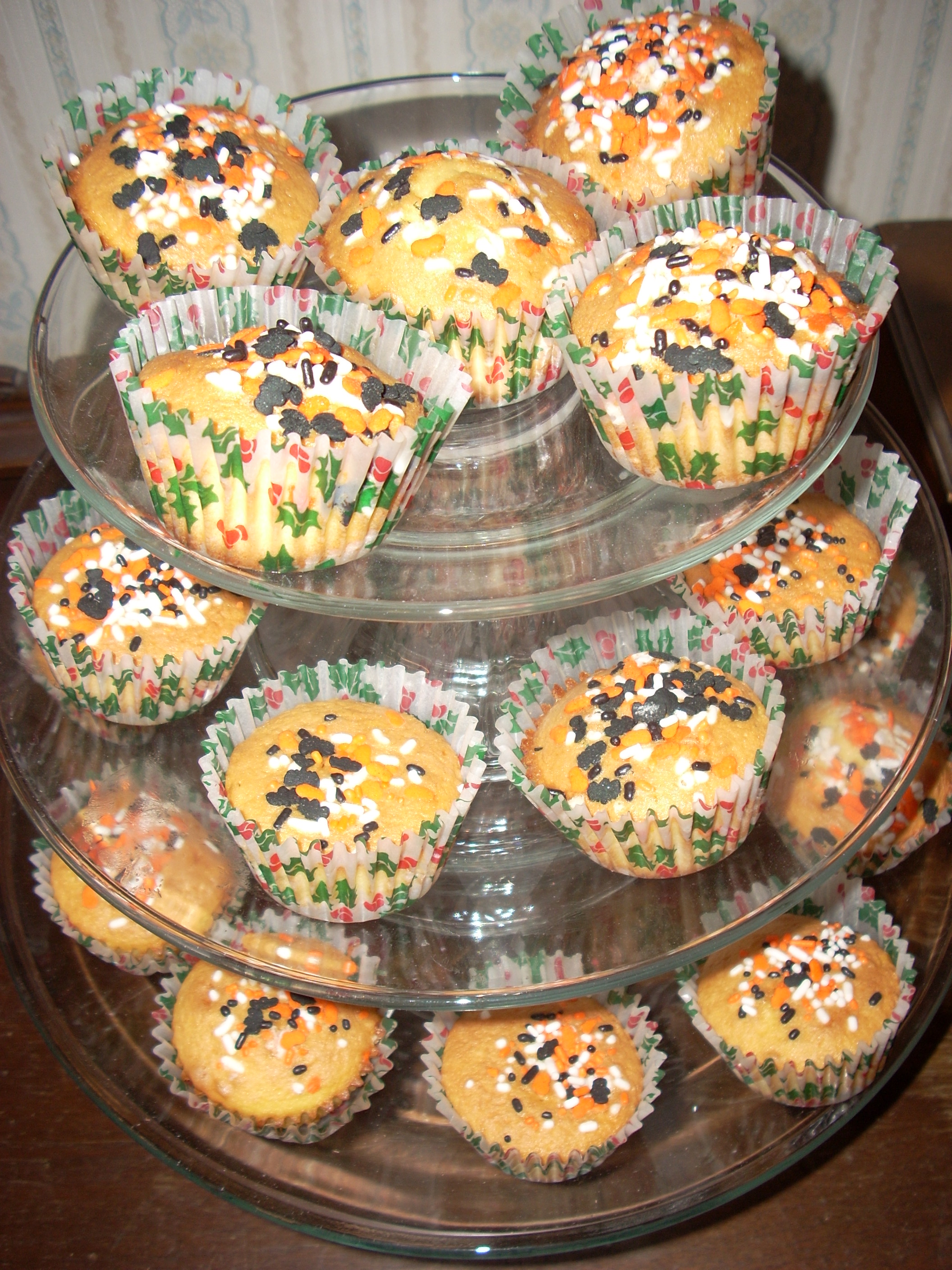 Today, however, I am making yellow cake from a mix because I had a late appointment last night and was knackered, as the Brits say, when I got home late. I may take some leftover chocolate sprinkles and plate them on top to add some color. The sprinkles are from Halloween treats and the cupcake liners are from Christmas. Wonder if the kids will care that I’m combining treats? Nah!