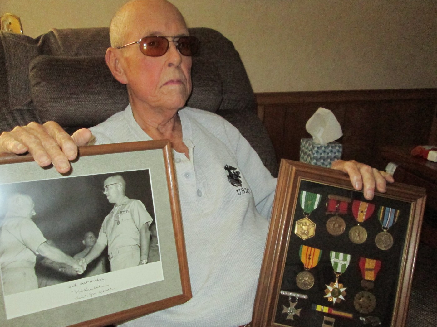 Cutline: First Lieutenant Skip Esmond of Bluffton holds a photo taken of him in 1968 receiving a commendation medal for serving in the American military as a Marine. Esmond served from 1949-1970.