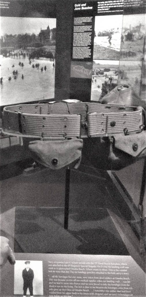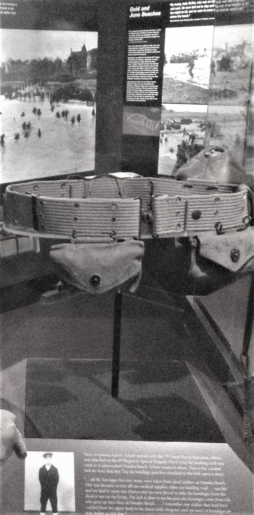 There, in a Plexiglas enclosure, was a photo of Leo. Better, it also contained his donated web belt and information about his service on Omaha Beach!