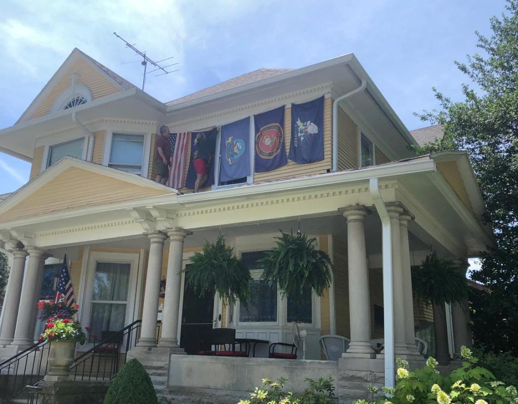 Finally, my cousins (by marriage but I like them enough that I pretend we are blood-related) Doctor Jim Mount and his wife, Rowena, have displayed his flags from various areas of military service he served under in the military on their home in Bedford, Indiana: US flag, Midshipman at Annapolis, Medical officer for Marines, Navy and SeaBees. How about that for patriotism!