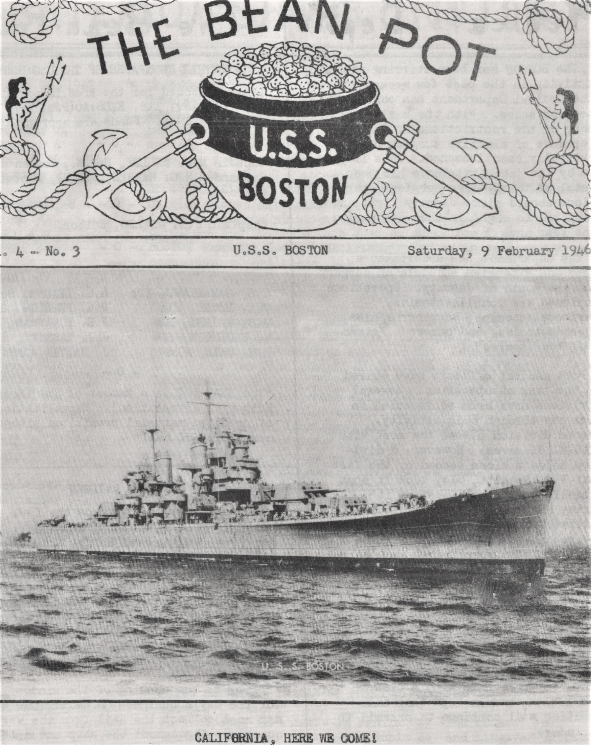 In January 1944, the ship sailed to the Marshall Islands where it joined the invasion there. During the next year and a half, the Boston’s crew took part in conflicts at the Palaus, Carolines, Western New Guinea, Truk, Saipan, Bonin Islands, Guam, Ulithi, and the Philippines. “We were in every major engagement in the Pacific,” said Loren.