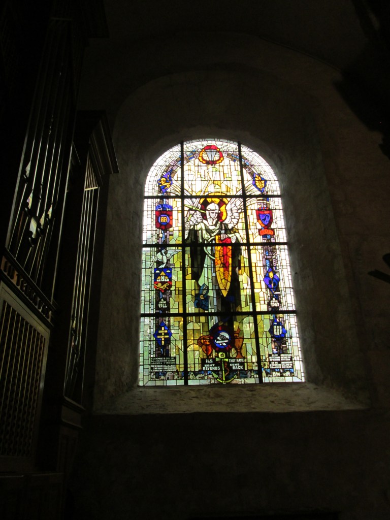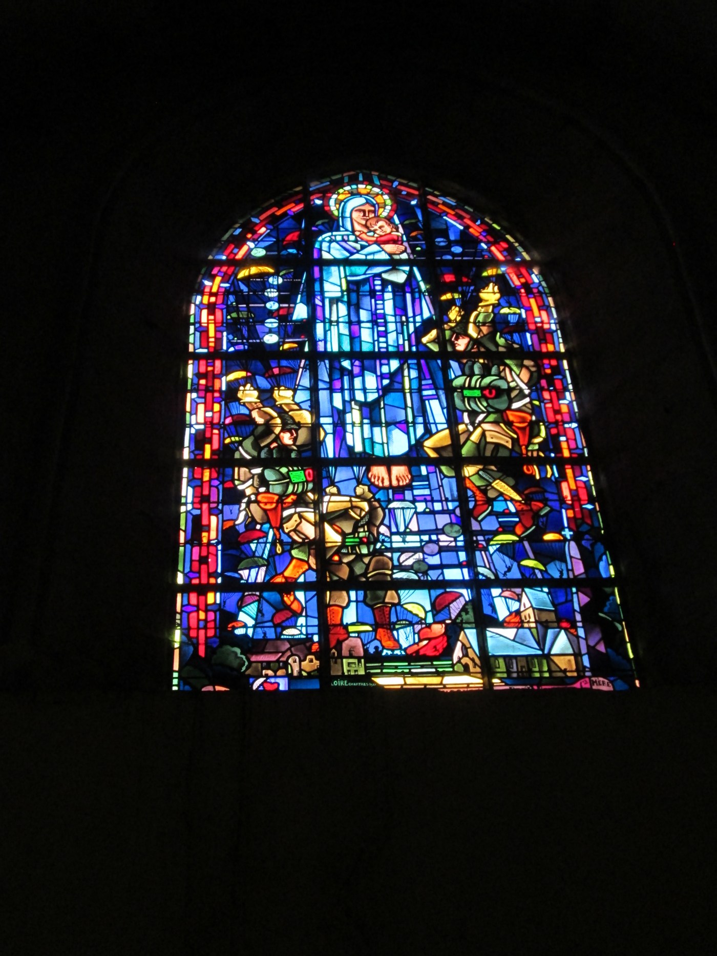 After the war, the windows were replaced with these lovely stained glass windows. In this window the archangel St. Michael is shown like an avenging figure amidst parachutes. The window was offered on the 25th anniversary by the veterans of the 82nd Airborne who landed that day.