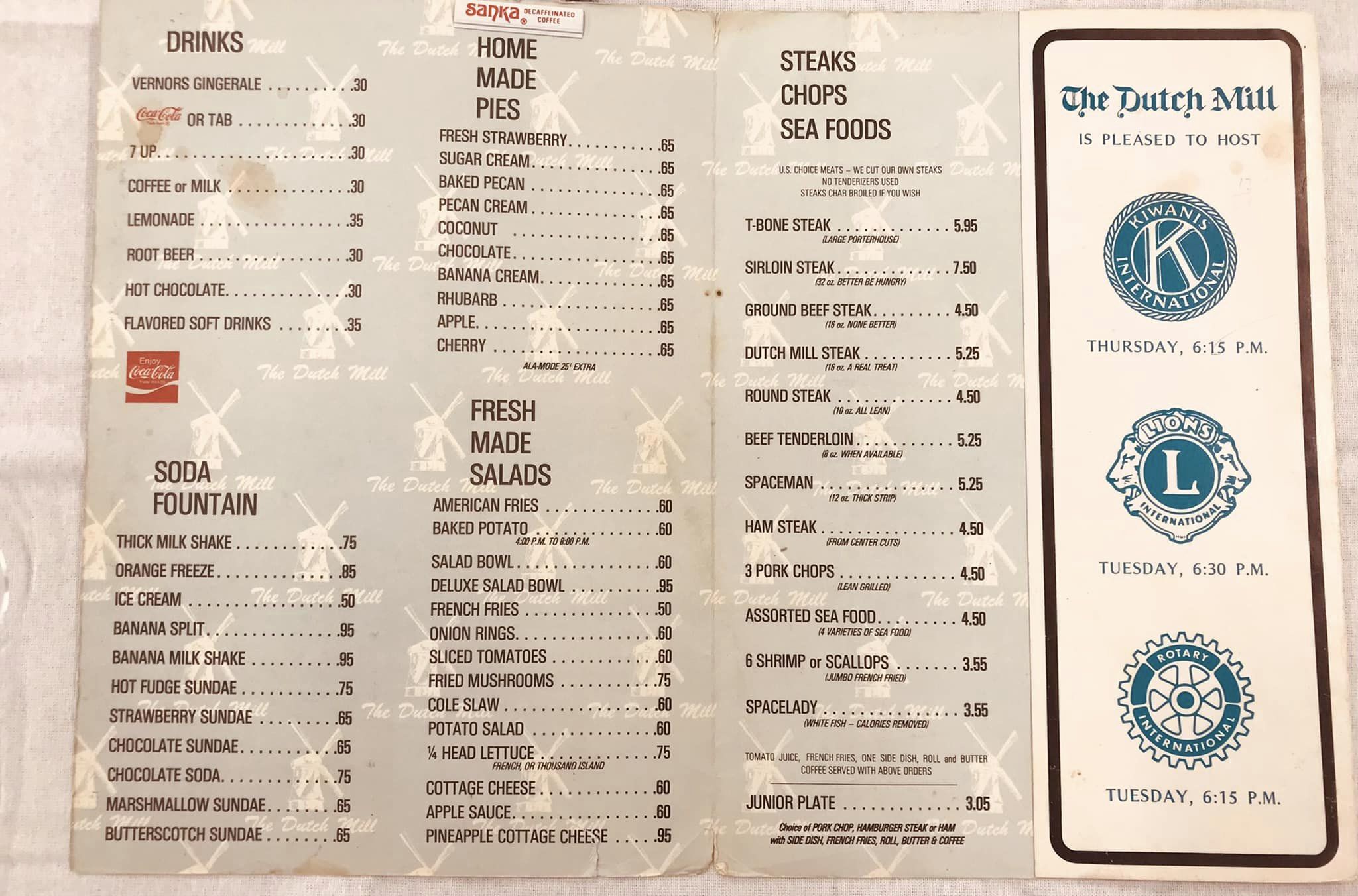 Other culinary favorites of the Dutch Mill were fruit salad with sherbet, vinegar slaw, giant (plate-size) sugar cookies, pizza burgers, and more.