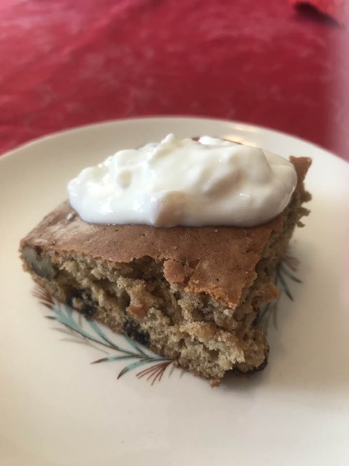 Brownstone Front Cake, freshly baked, sits on a vintage dessert plate adorned with a dollop of peach Greek yogurt.
