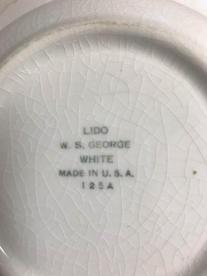 It is stamped ‘Lido W.S. George’ on the bottom. An Etsy entry said W.S. George White “Lido” Dinnerware was made in the USA in the 1930’s.