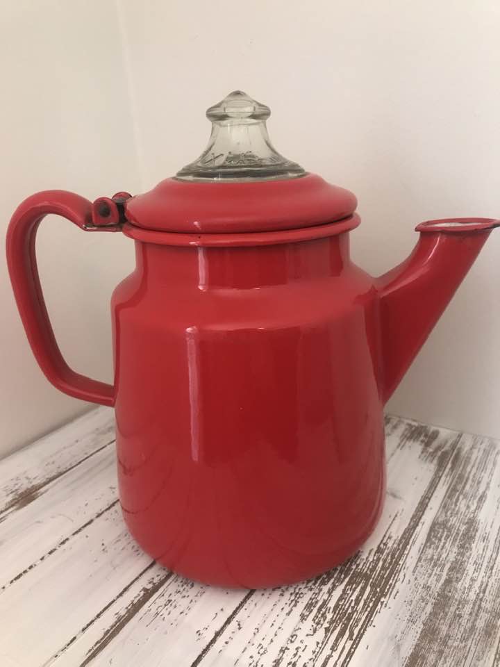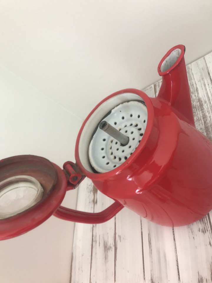 The same sister who gifted me with the vintage cookbook used in this post also shared this great red coffee percolator from her husband’s family. They lived in Kentucky and from its use, they enjoyed their coffee.