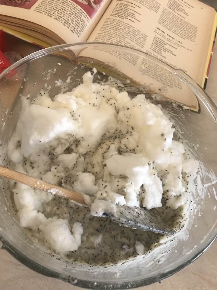 Beat in vanilla, milk, and poppy seeds.