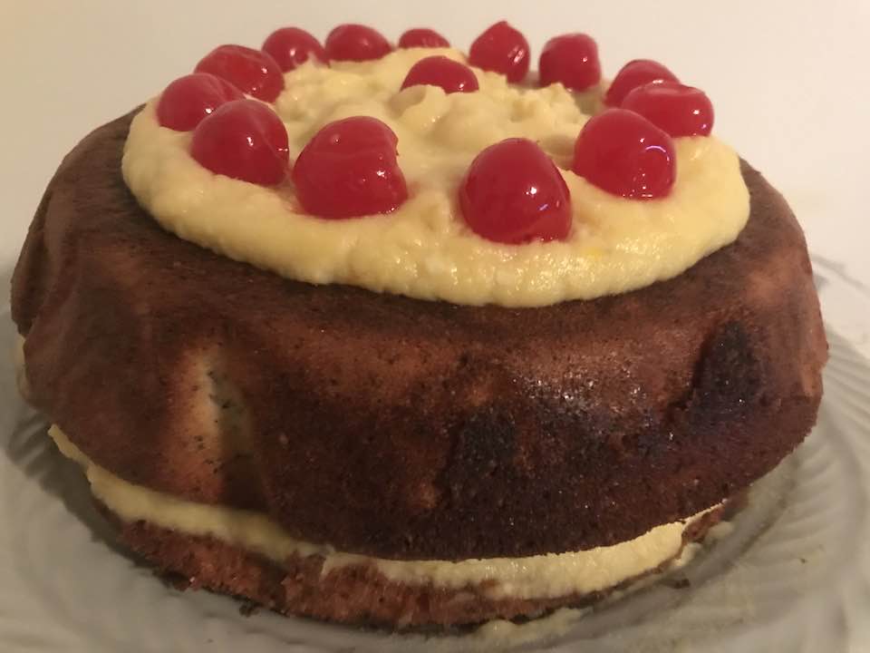 - As my two cake pans were occupied with another baked good, I poured this batter into two slanted pie pans lined with pastry paper. By inverting one layer on top of the other after applying the filling in the middle, I created a sort of ‘UFO’ look before covering the top with filling and maraschino cherries. Unique!