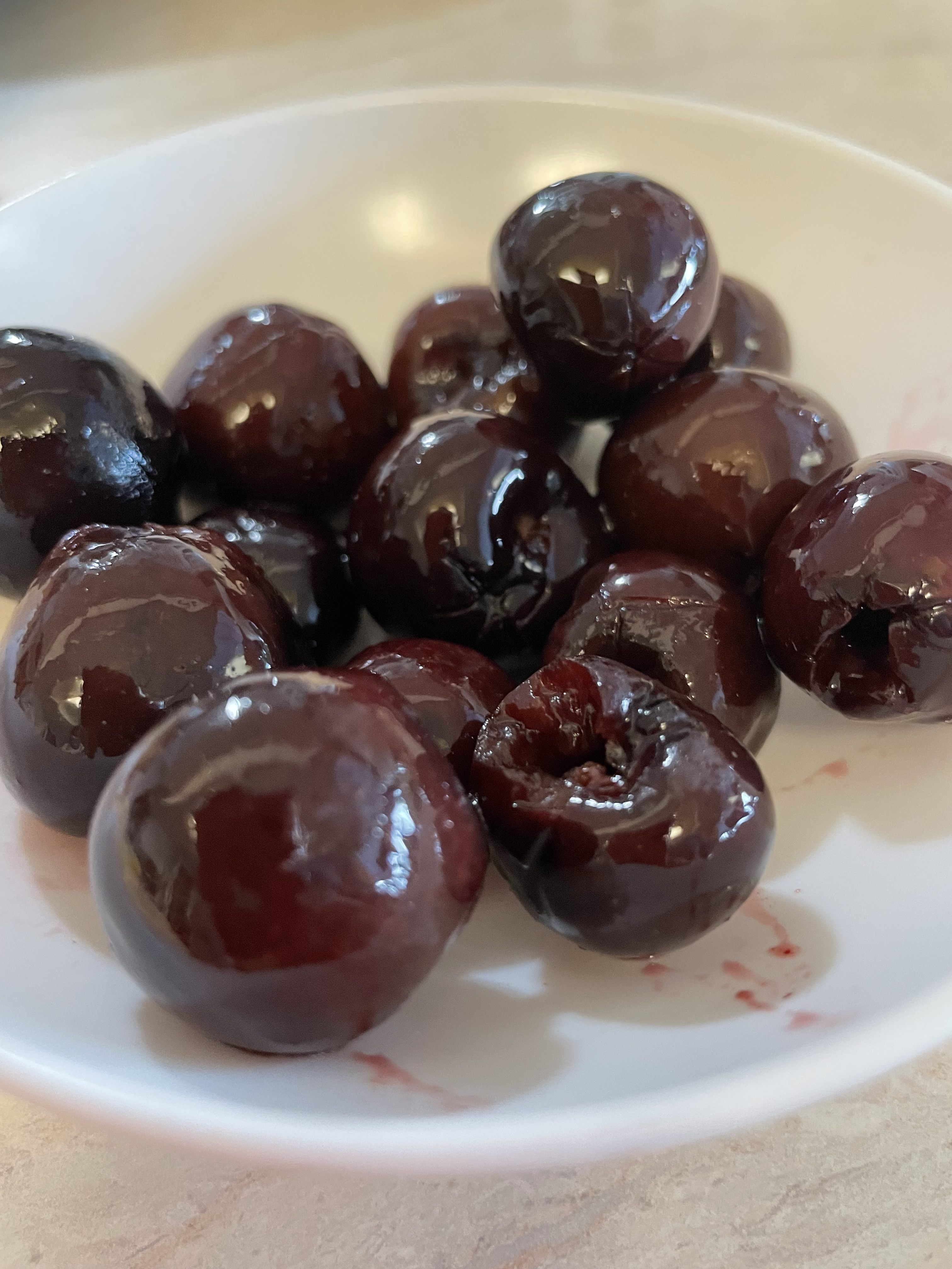 One thing I really like about this recipe (other than that it is delicious!) is its versatility. The recipe calls for white cherries – I couldn’t find them so I used frozen dark ones.