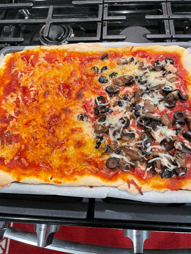 I figured my toppings cost under $5.00, and with the crust itself is basically free, making this dish was very cost effective. Plus, I know every ingredient inside. The black olives and mushrooms are only one side because other eaters in my household preferred just pepperoni and cheese. Also I forgot to add the Italian seasoning and oregano. Oh well, next time.