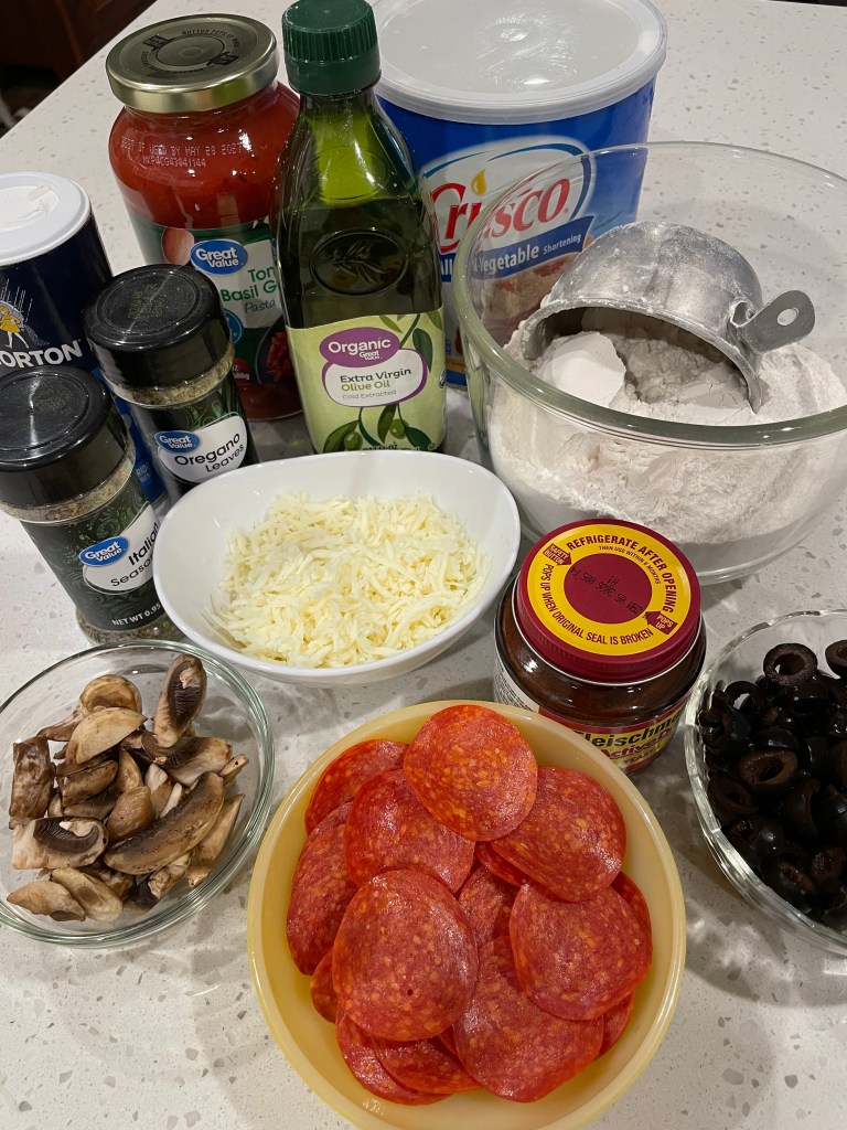 - I took many liberties with the pizza toppings, using spaghetti sauce in lieu of the tomato sauce. Pepperoni, black olives, and mozzarella cheese in my refrigerator and pantry finished off this tasty pizza!