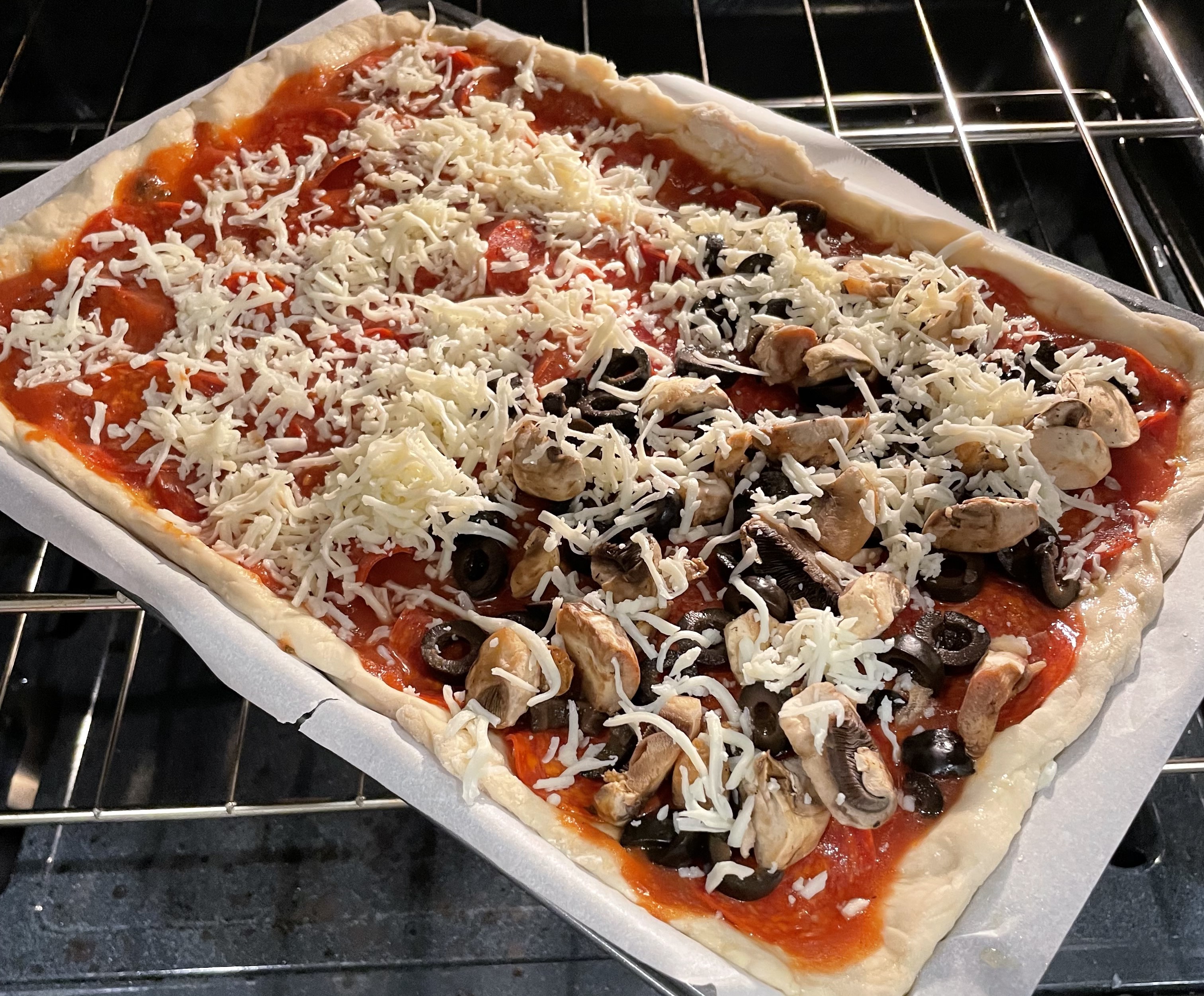 - Lacking a traditional round pizza pan, I improvised with a 10”x14” pan. I put the entire amount of dough inside which gave the pie a thick crust. You could make it in a larger pan with a thinner crust and more pieces or two pans.