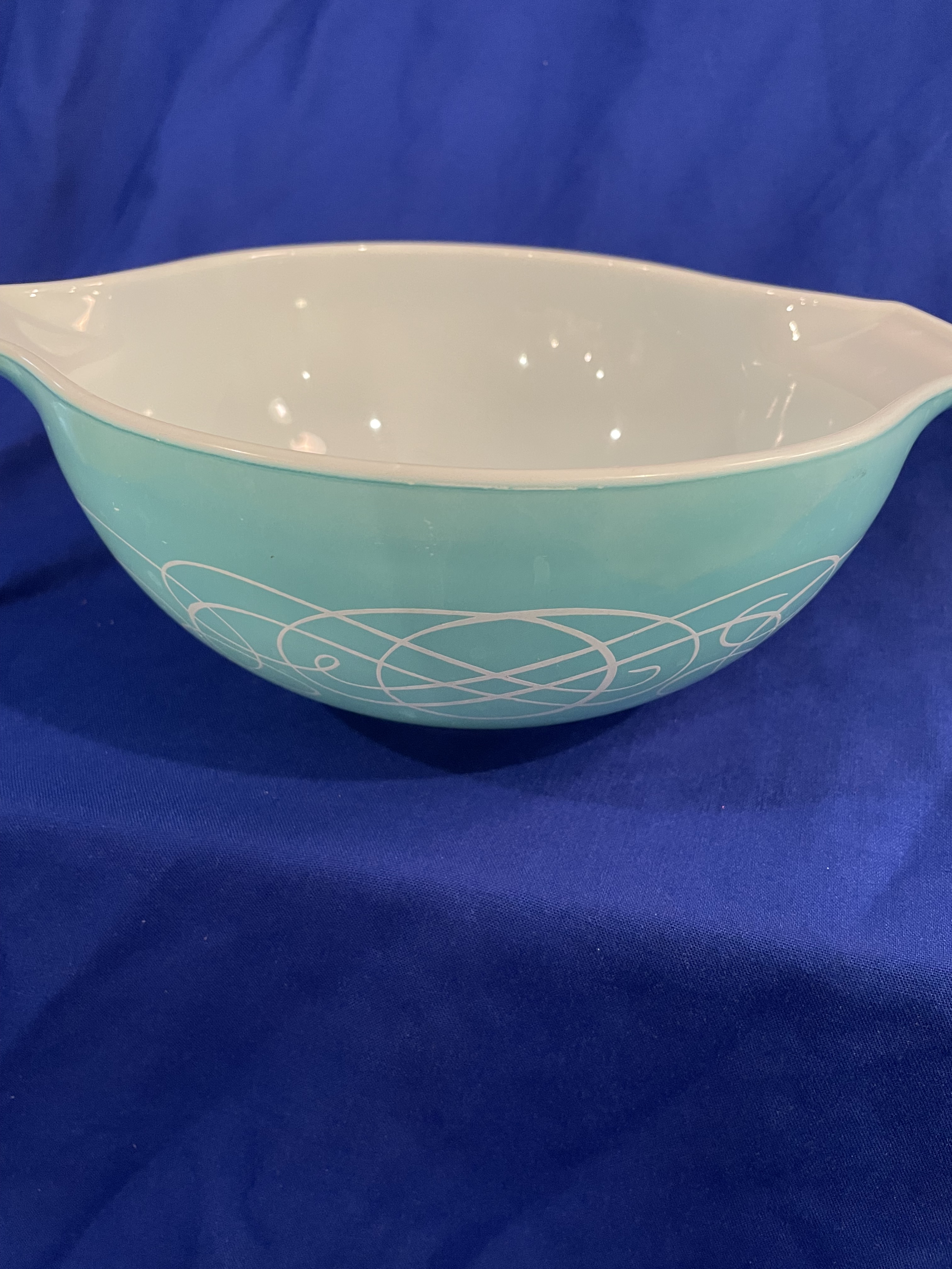 This beautiful Pyrex mixing bowl held my crust mix while rising. I found it in a thrift shop and just love the size, newness (it looks unused!), color and design. It has taken pride of place in my cabinets with my frequent usage!