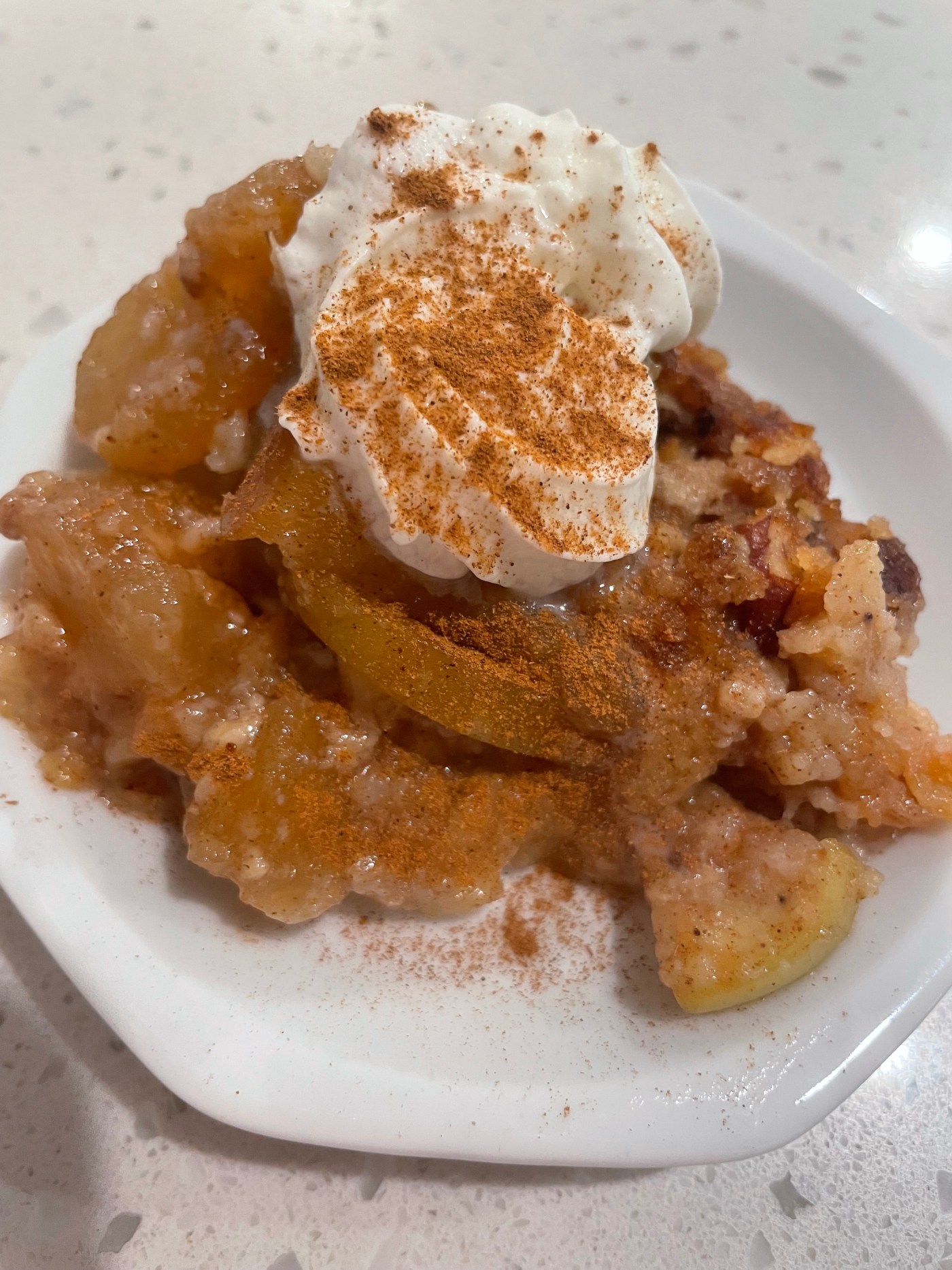 But in reading through this recipe it seemed like this was a doable treat. At the end I concluded it was not difficult and the scent of baked apples and their accompanying spices (cinnamon and nutmeg) filled the house with goodness. It didn’t spoon out as perfectly as I would have hoped for a stunning photo, but I hope you get the idea of its sweetness from the simple shot w/ a dollop of whipping cream on top.