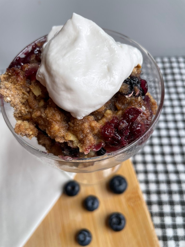 The assembly is so quick and easy – you can have it out of the oven in little over an hour. Let it cool slightly before spooning over ice cream, yogurt or whipped cream.