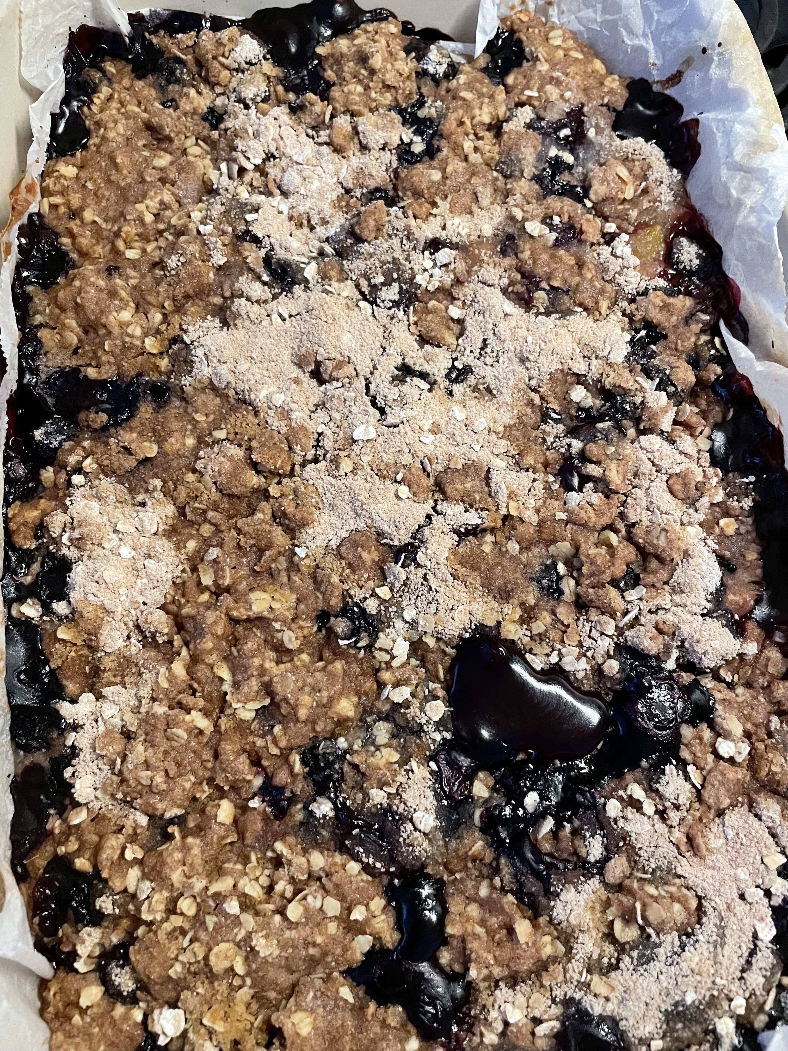 Back home, I found it easy to make this dessert by simply adding one cup of blueberries to a regular rhubarb dessert. No need for extra sugar or thickener if you thoroughly drain the blueberries after washing.