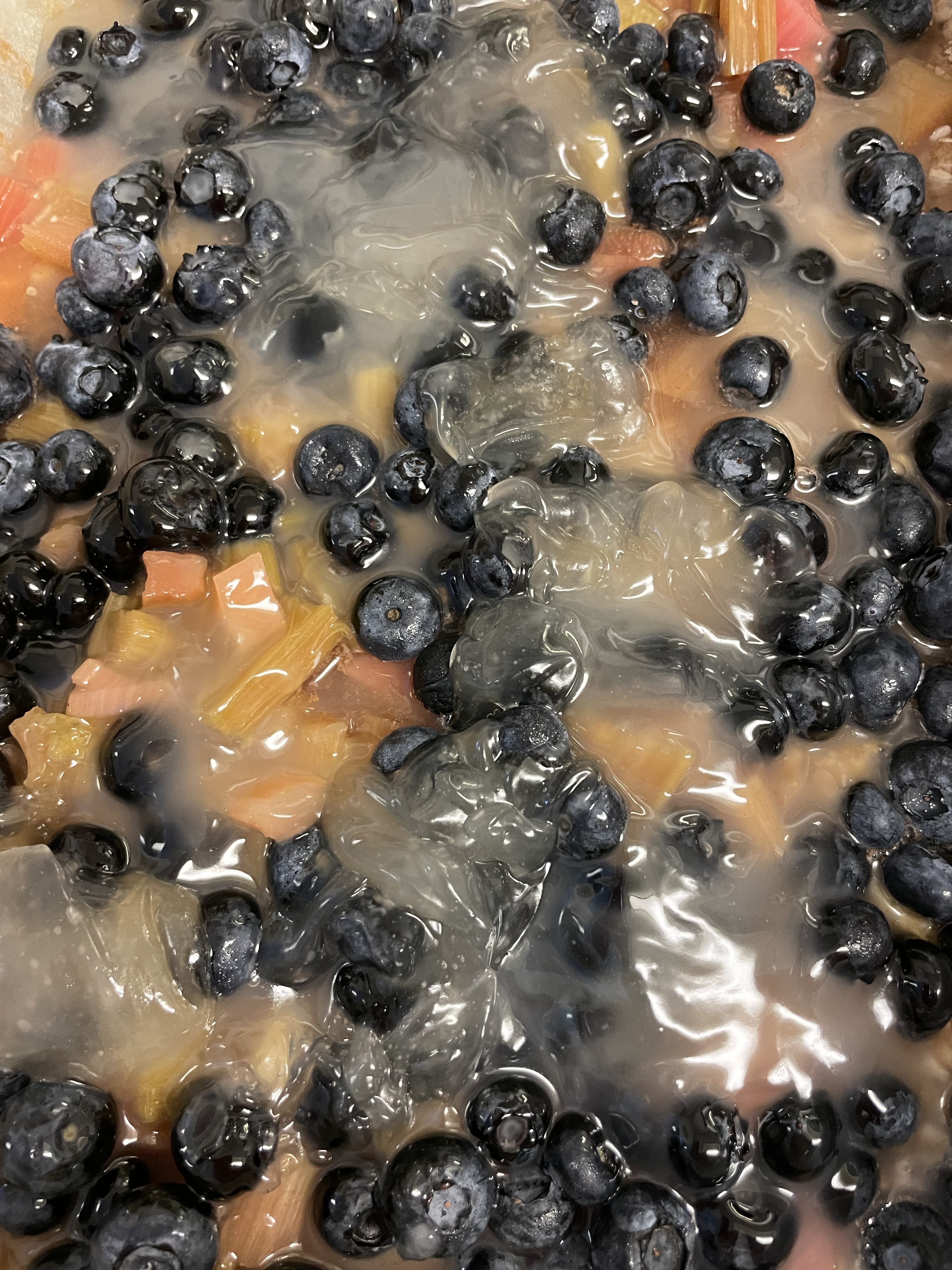The result exceeded our expectations. The blueberries melded with the rhubarb so well that you could not pick out where the rhubarb began and the blueberries ended. It was scrumptious!