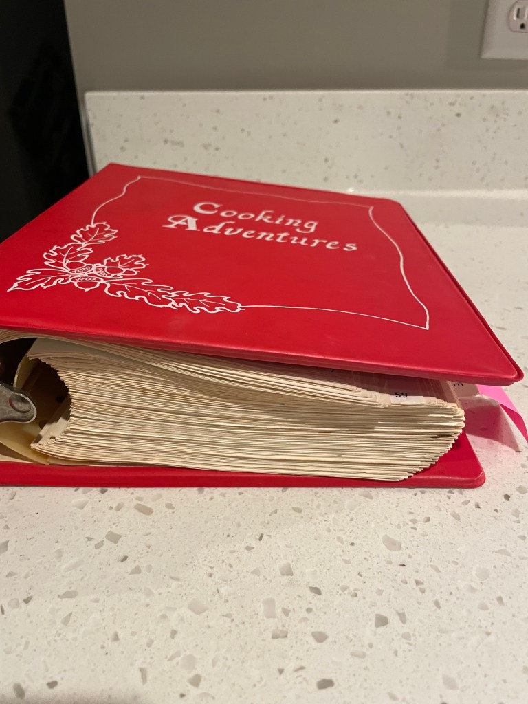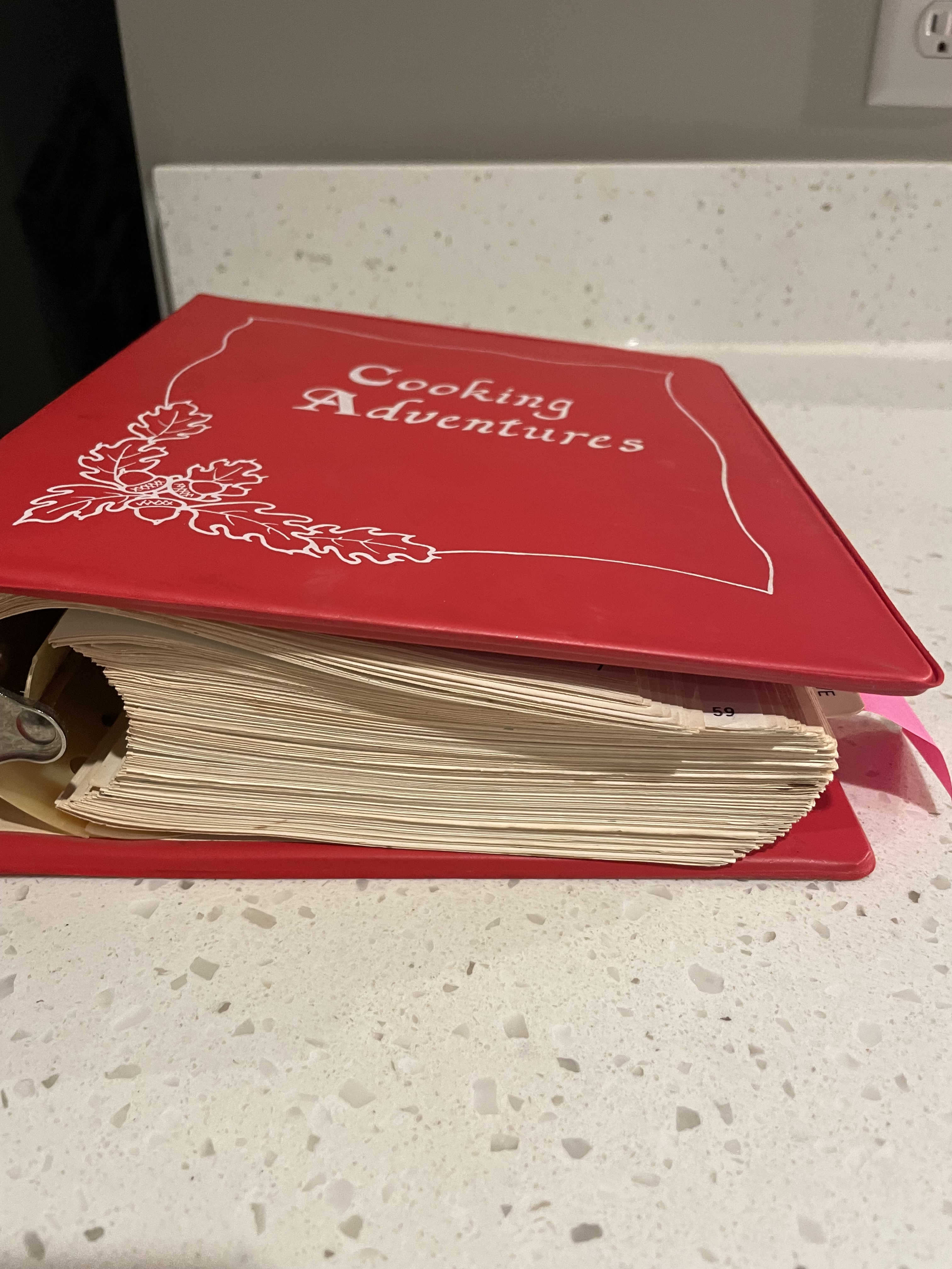 The cookbook has no page numbers, but it contains hundreds of recipes as you can see from this bottom view of the pages.