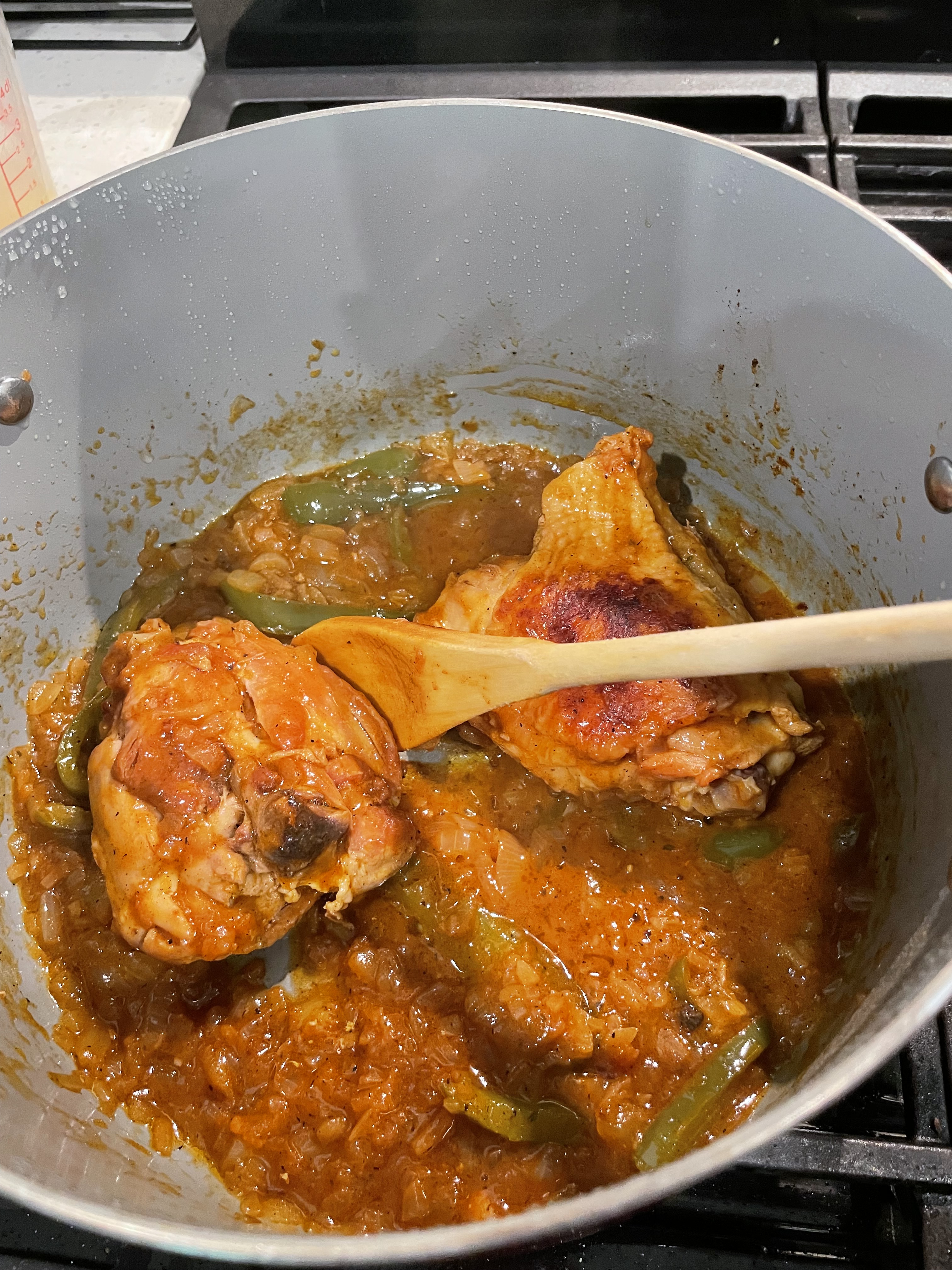 Add salt, peppers, cinnamon, tomato sauce, and half of the chicken broth.
