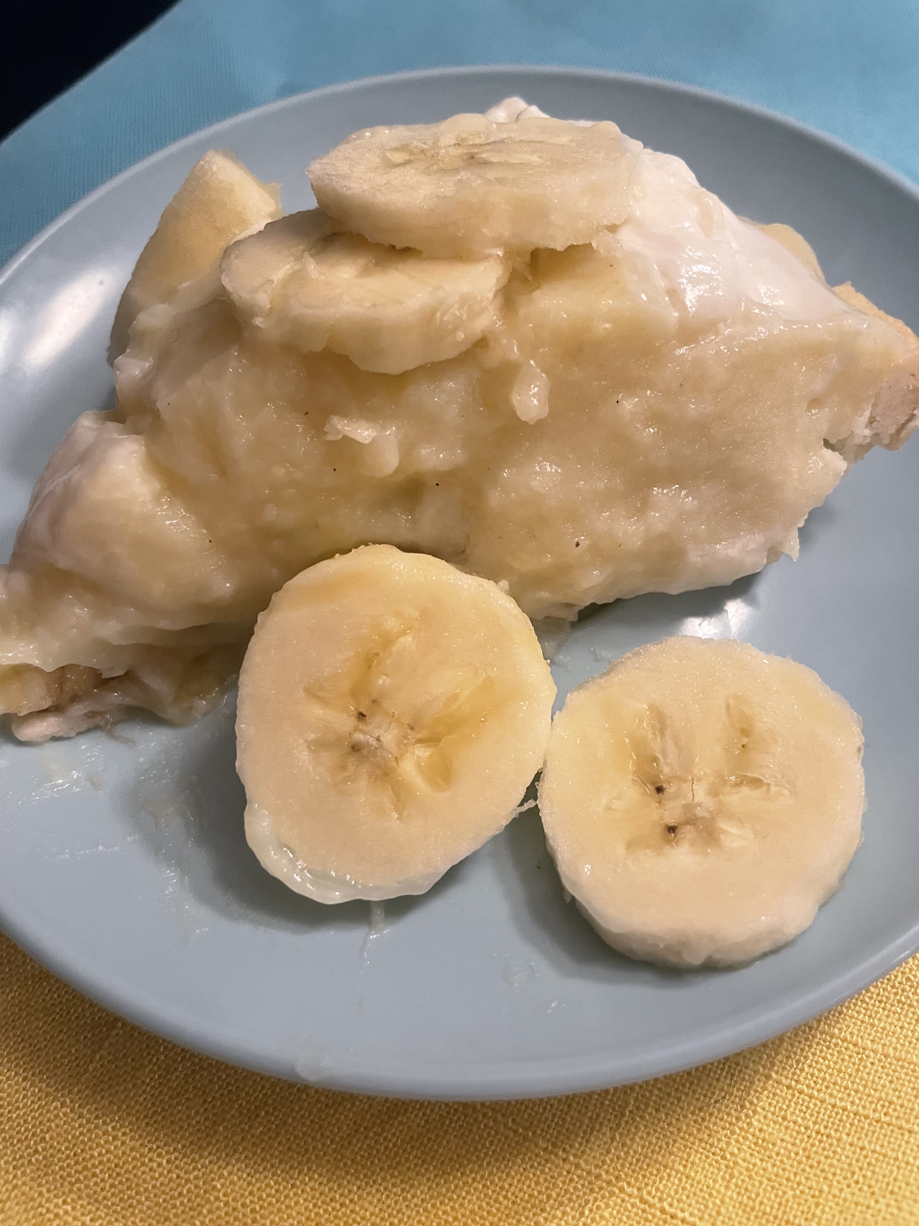 While I really like how this recipe turned out, I did modify the cooking techniques somewhat. I made Banana Cream Pie from scratch often when my kids were growing up (a good way to get more calcium in them) so I knew what to expect in the process when the recipe didn’t spell it out.