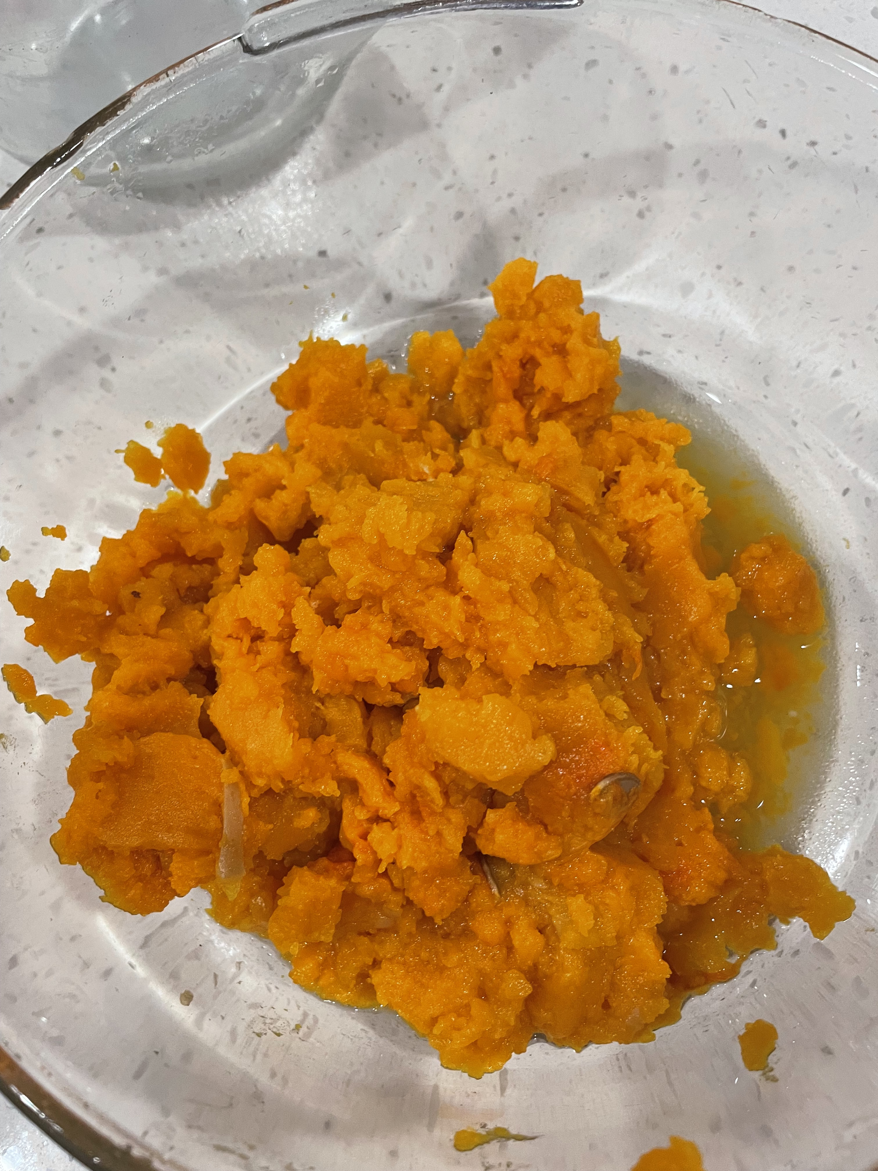 The recipe calls for three cups of pulp. The easiest way I found to create this was to slow-cook it. If you have a large squash, cut it in half.