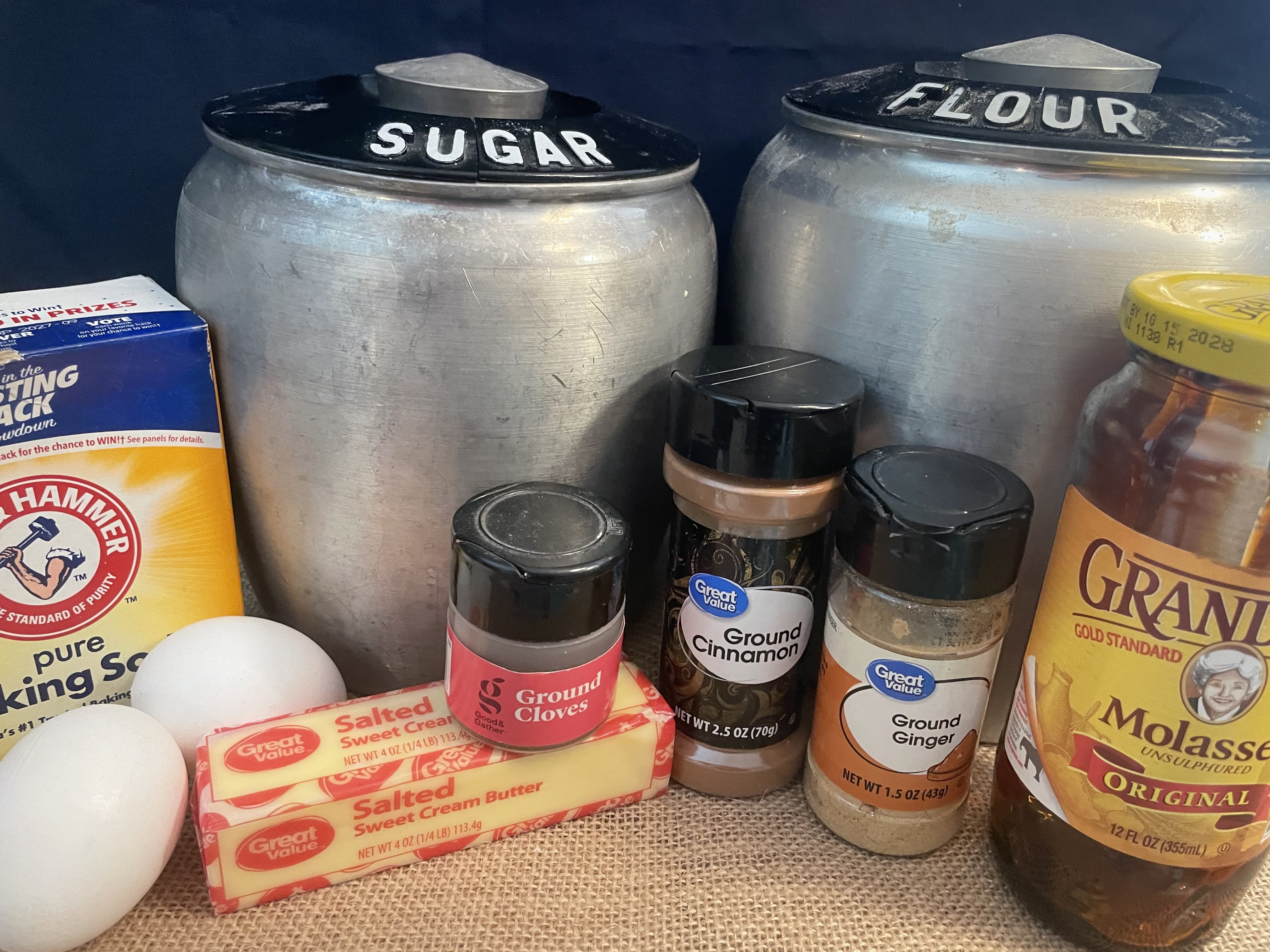 “Half cup sugar, 1 cup molasses, ½ cup butter, 1 teaspoon each ginger, cinnamon, cloves, 2 teaspoons soda dissolved in 1 cup boiling water, 2-1/2 cups flour, add 2 well-beaten eggs the last thing before baking. This is excellent.”