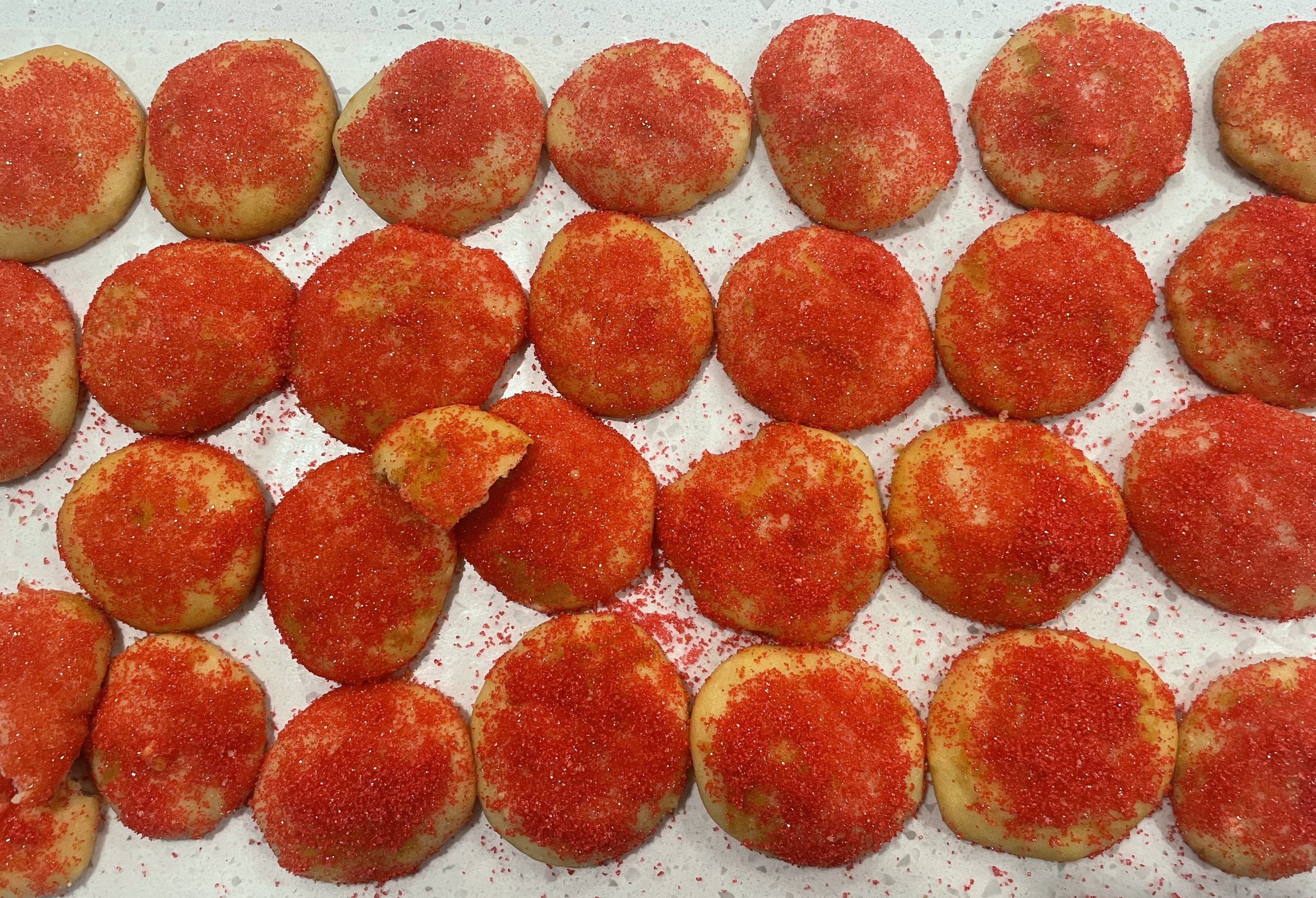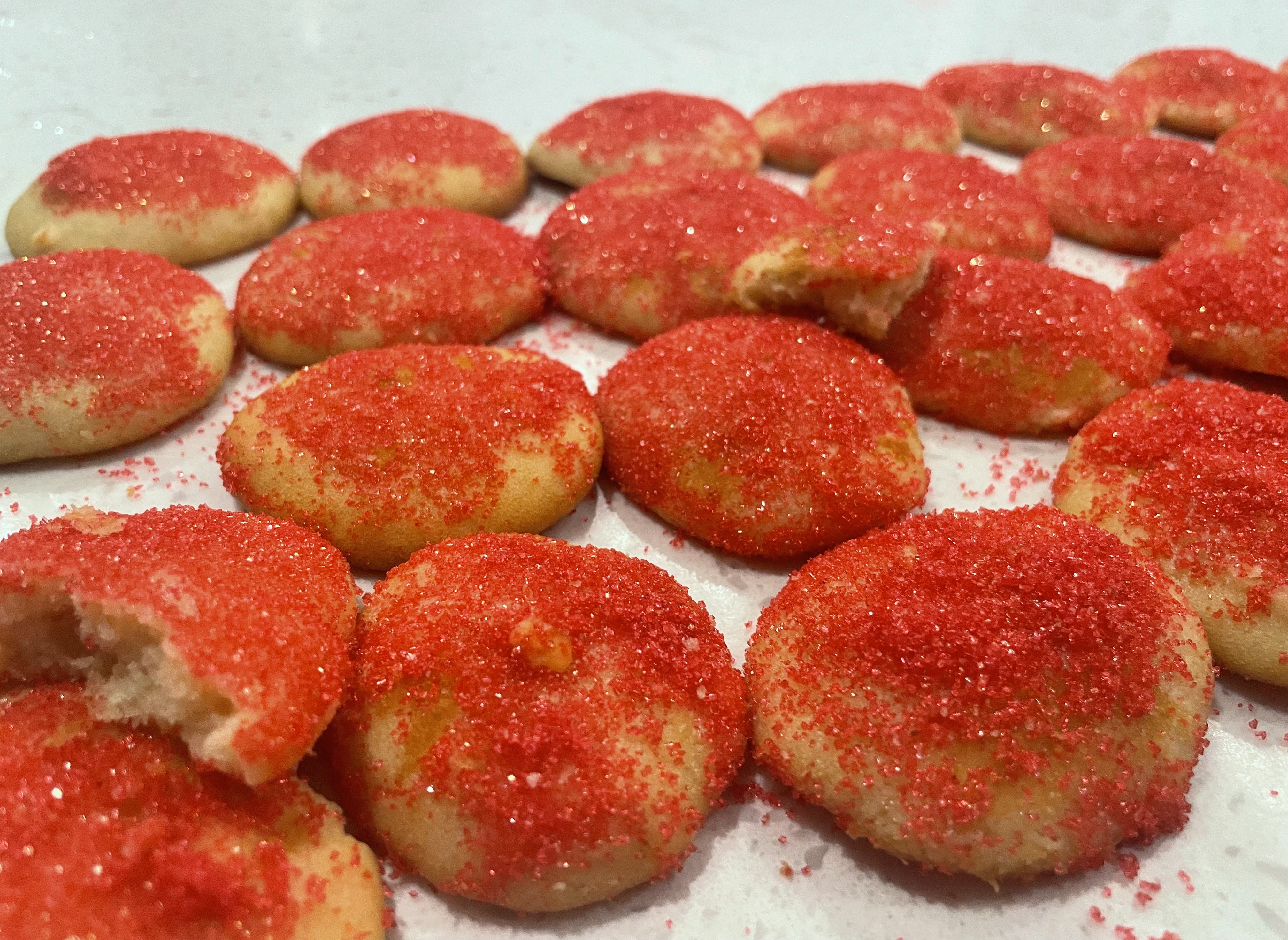 “A easy-to-mix cookie with a soft interior made festive with red icing sugar”