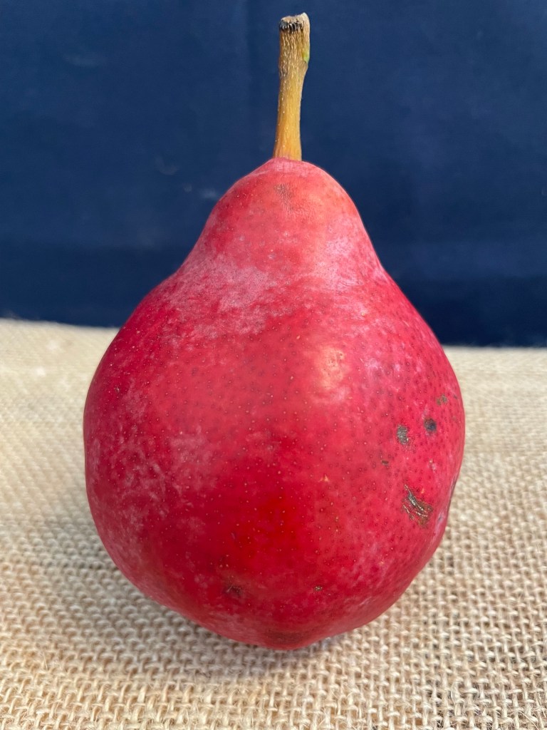 As you may have guessed from viewing the fruit, it was not a persimmon, which is shaped more like a tomato, but indeed a pear – a Starkrimson (pronounced star-KRIM-son) variety.