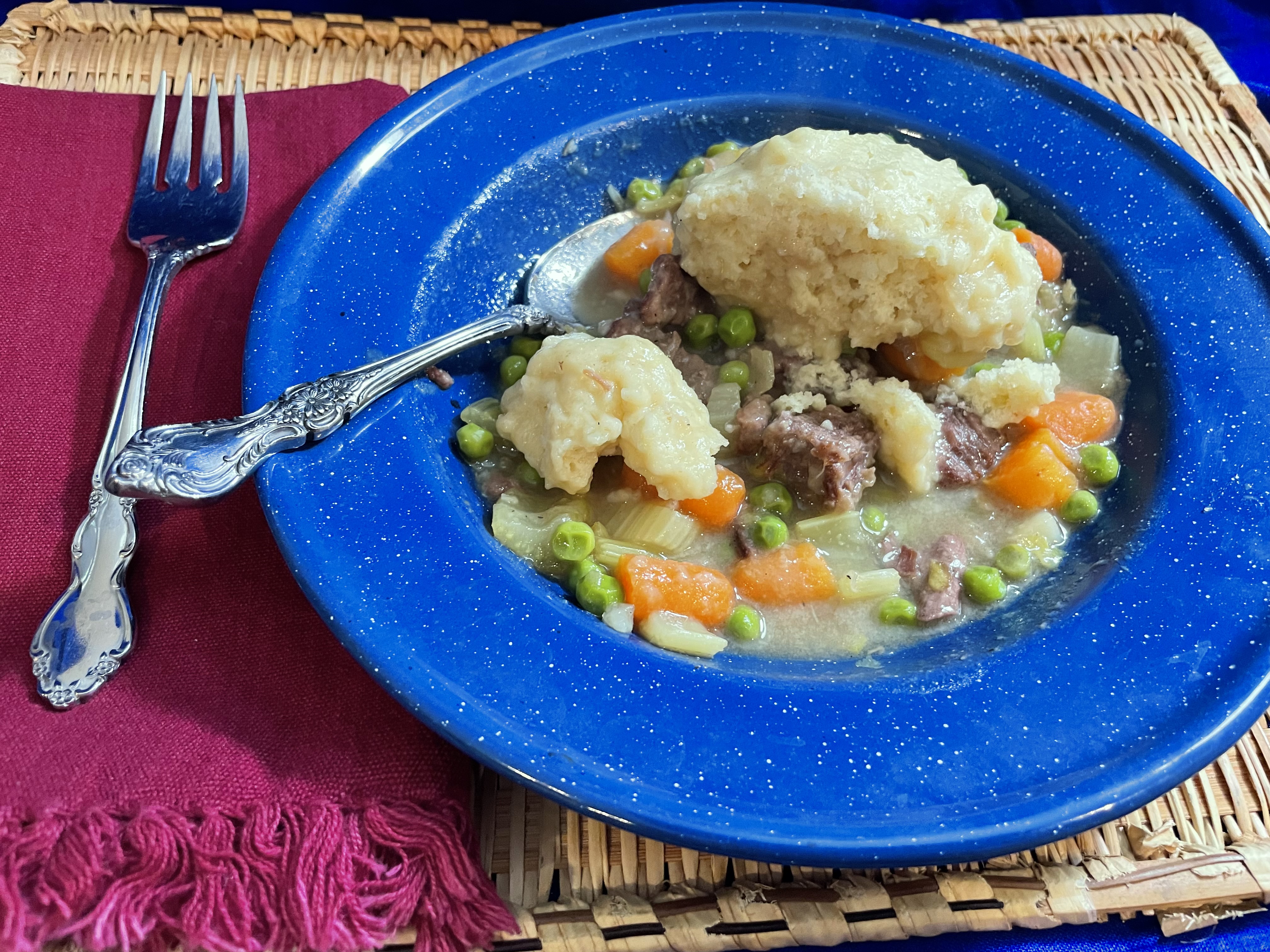 These dumplings broken up to soak up stew juices were soft and yummy. I’m not much of a dumpling eater, but these were more like biscuits rather than the doughy mounds I grew up with always served with chicken and noodles. They always tasted too plain for me to enjoy. Sorry, Mom and Grandma!