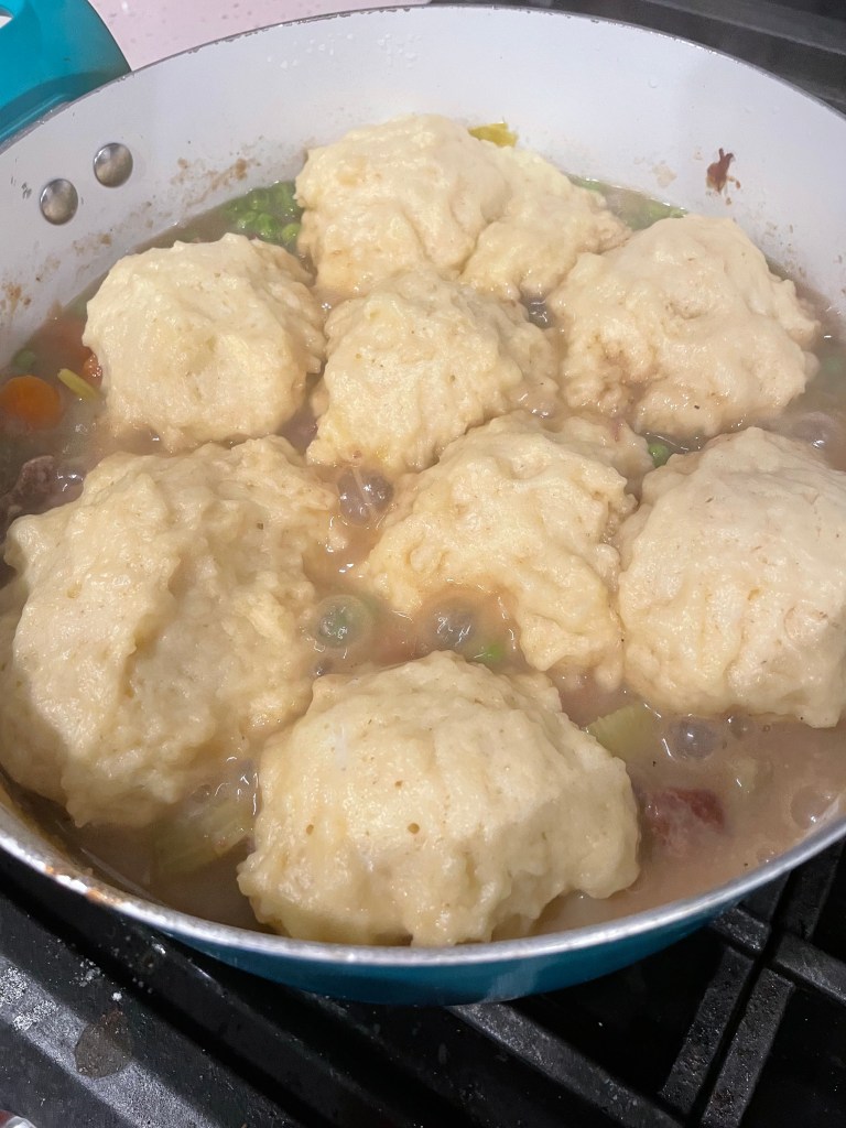Drop 8-10 tablespoons of dumpling mix on top of stew; cover.