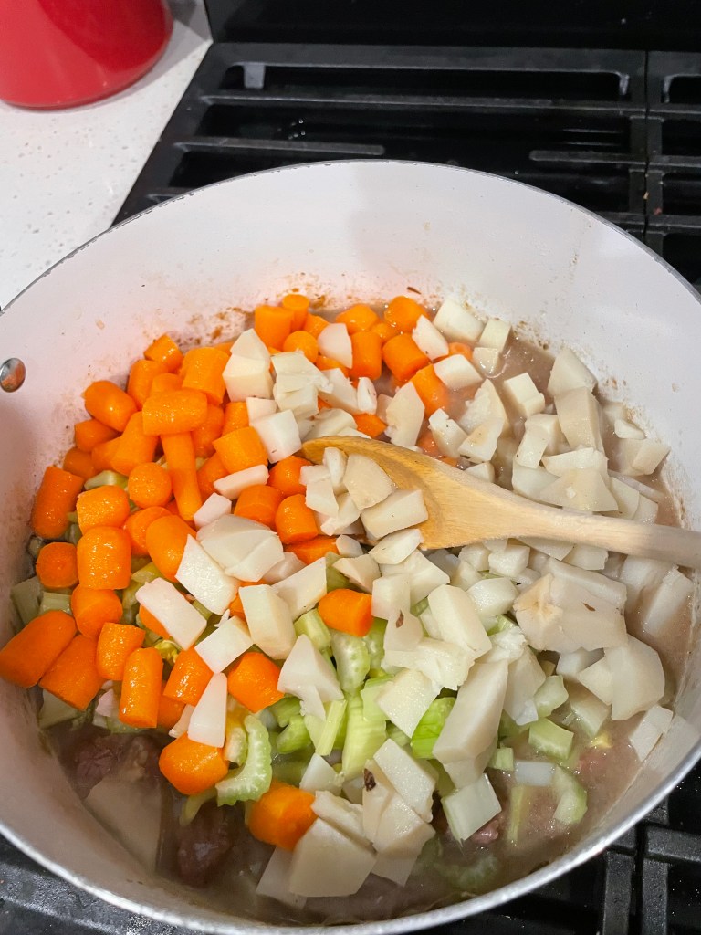 - With only three potatoes on hand, I supplemented the vegetables with 1 cup of diced celery.