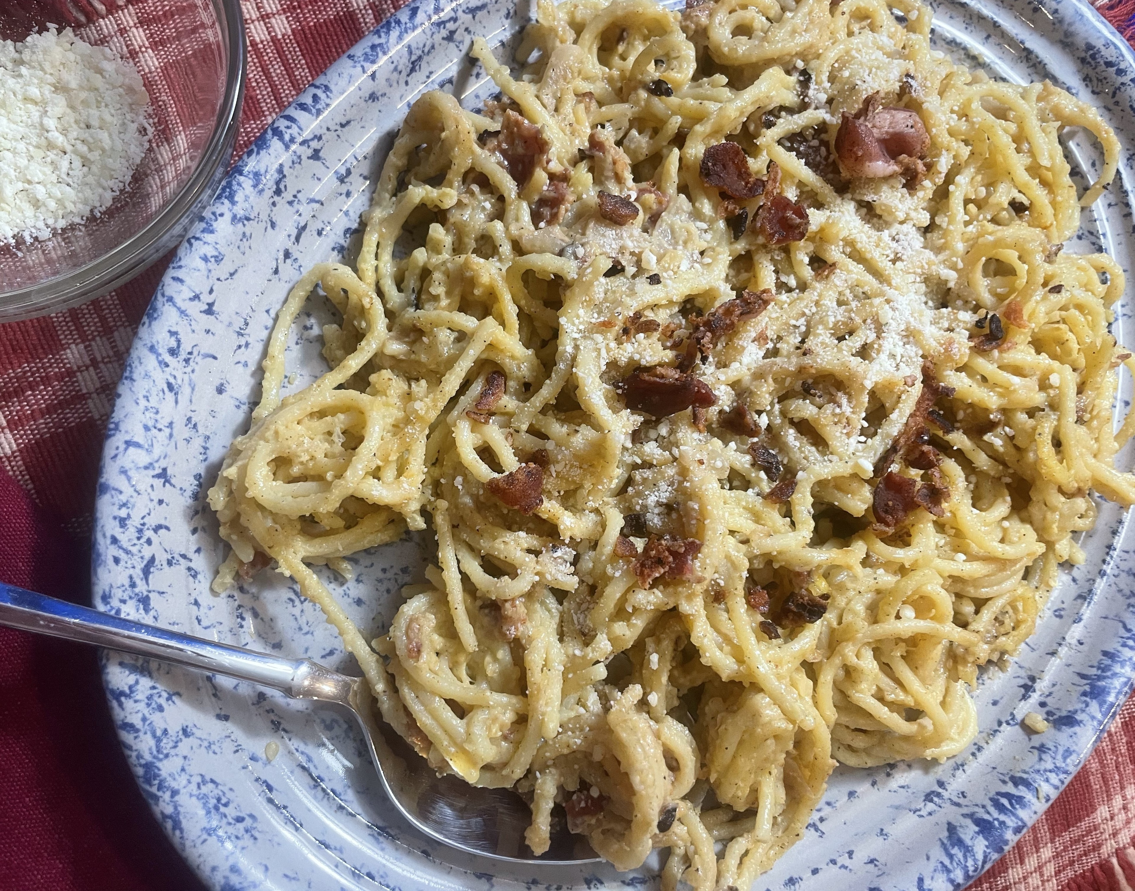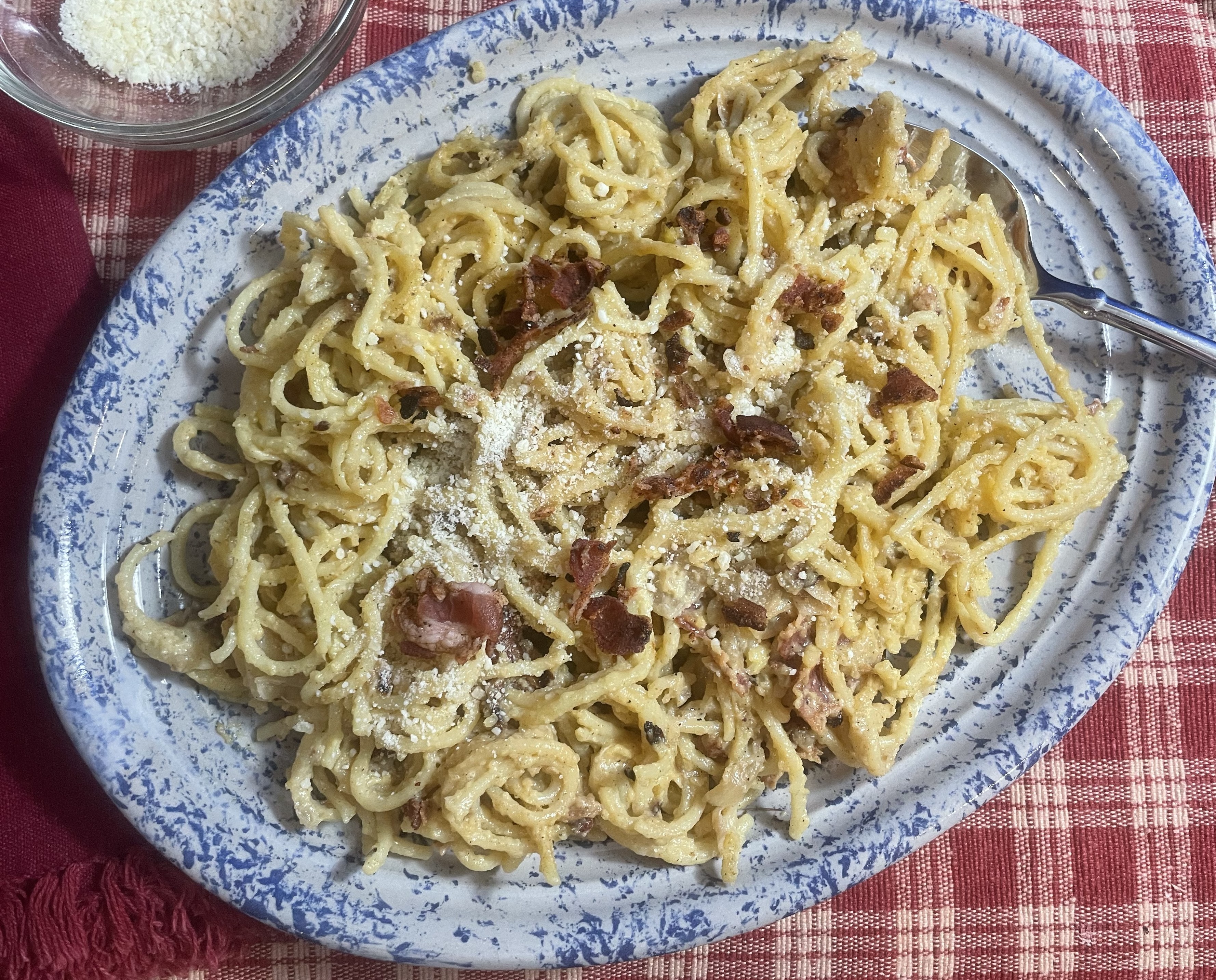 As for the recipe for Creamed Spaghetti, it is simple and fast to make–about 20 minutes. It is economical with the only expense being the bacon and pound of spaghetti (approximately $6.00 for both in my area). I like the fact that it is enriched with eggs and dairy with some meat, though the bacon could be left out for a meatless meal.